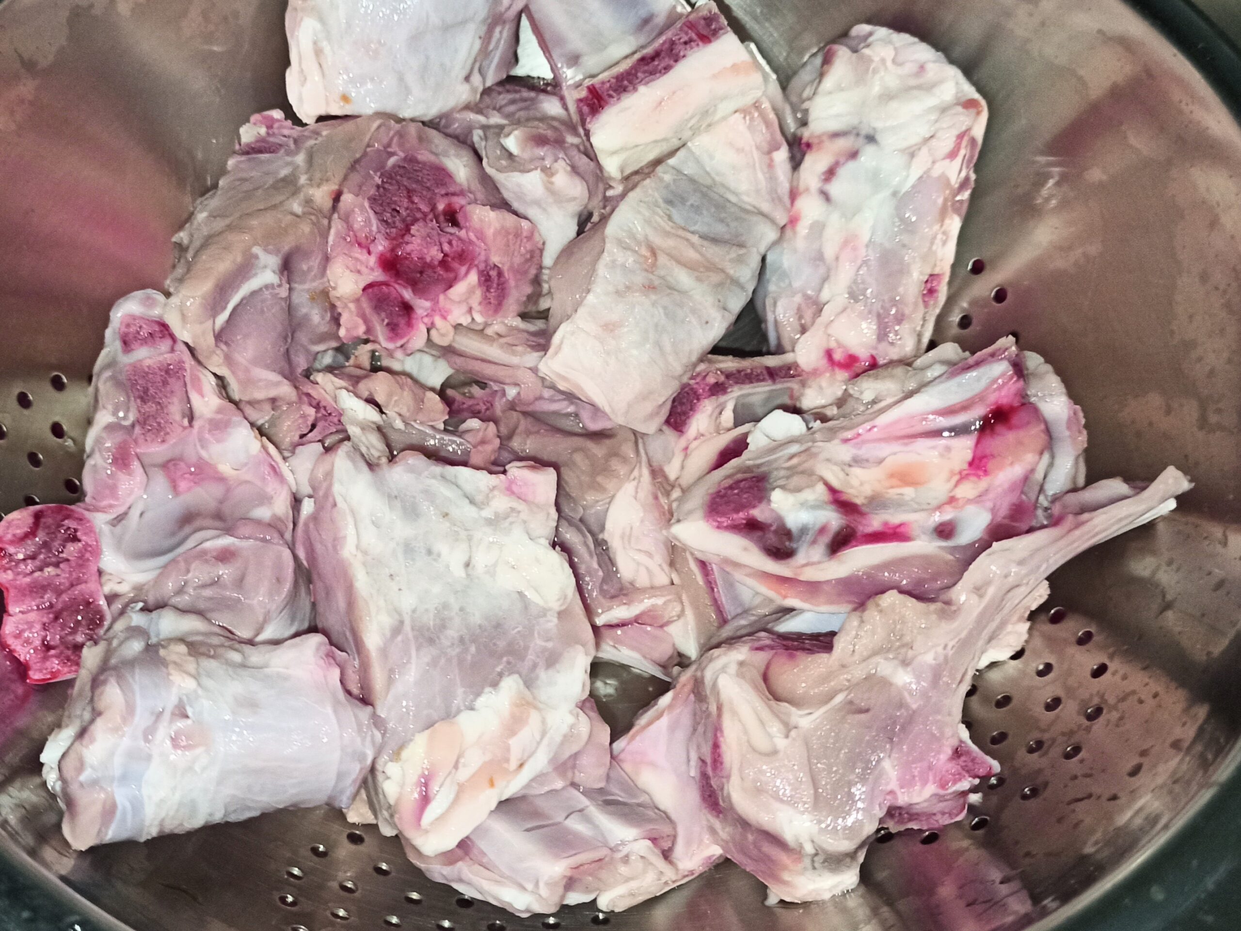 Per preparare l’agnello alla cacciatora, iniziate a mettere i pezzi di agnello, in una capiente ciotola.