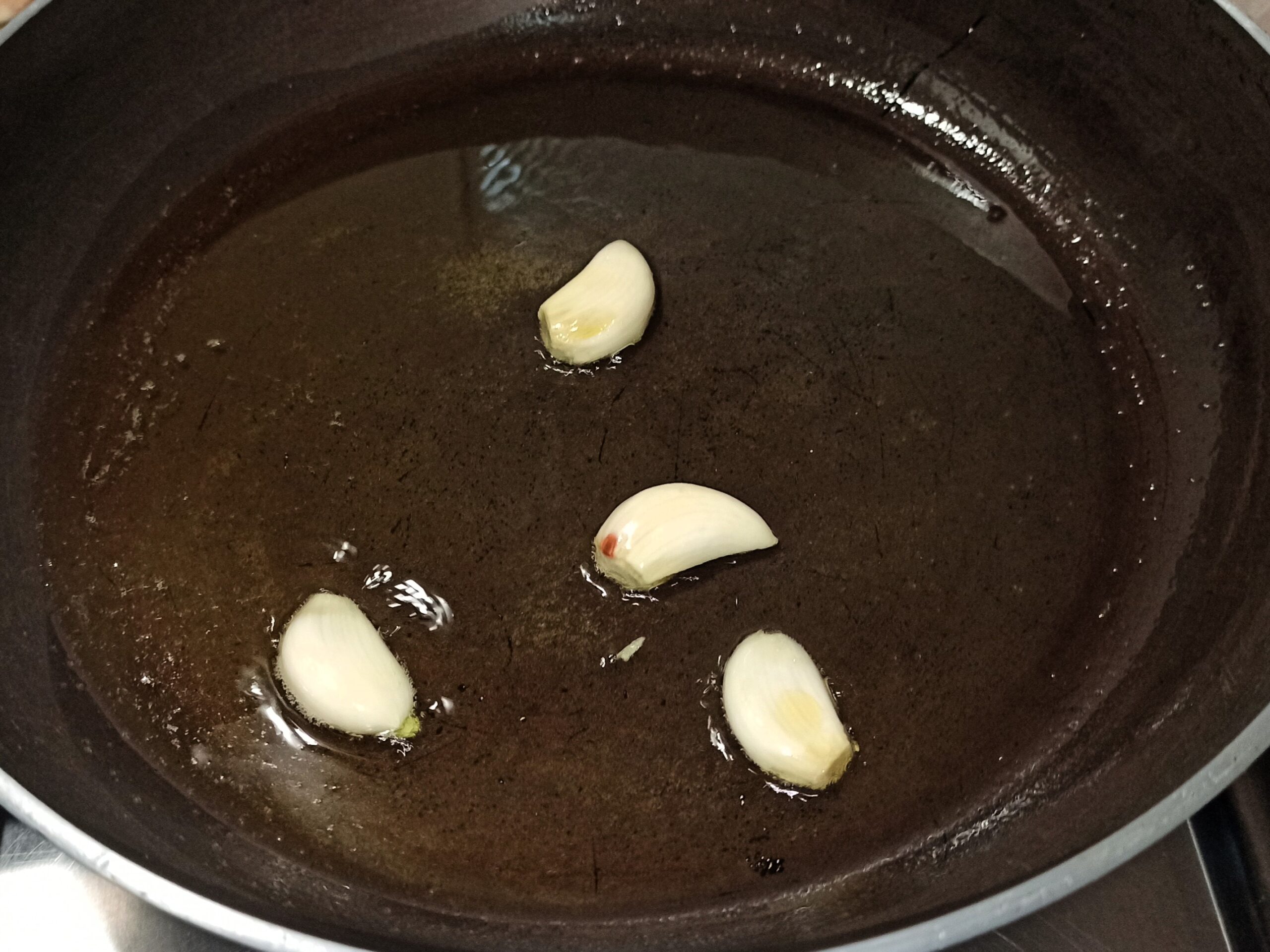 In una capiente padella, mettete un giro d’olio evo, dividete gli spicchi d’aglio a metà, fateli imbiondire ed eliminateli.