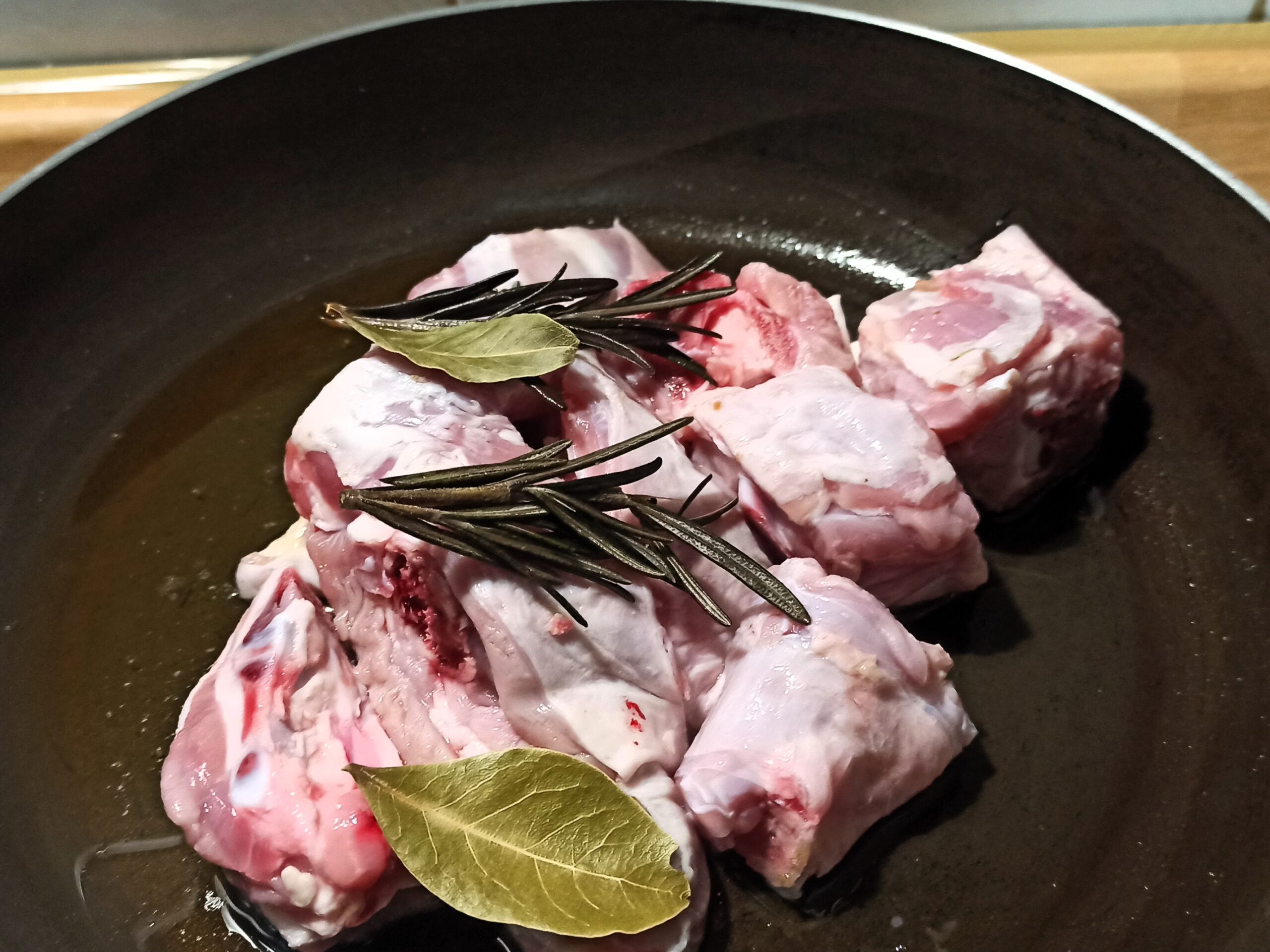 Aggiungete i pezzi di agnello, le foglioline di alloro, il rosmarino e la salvia.