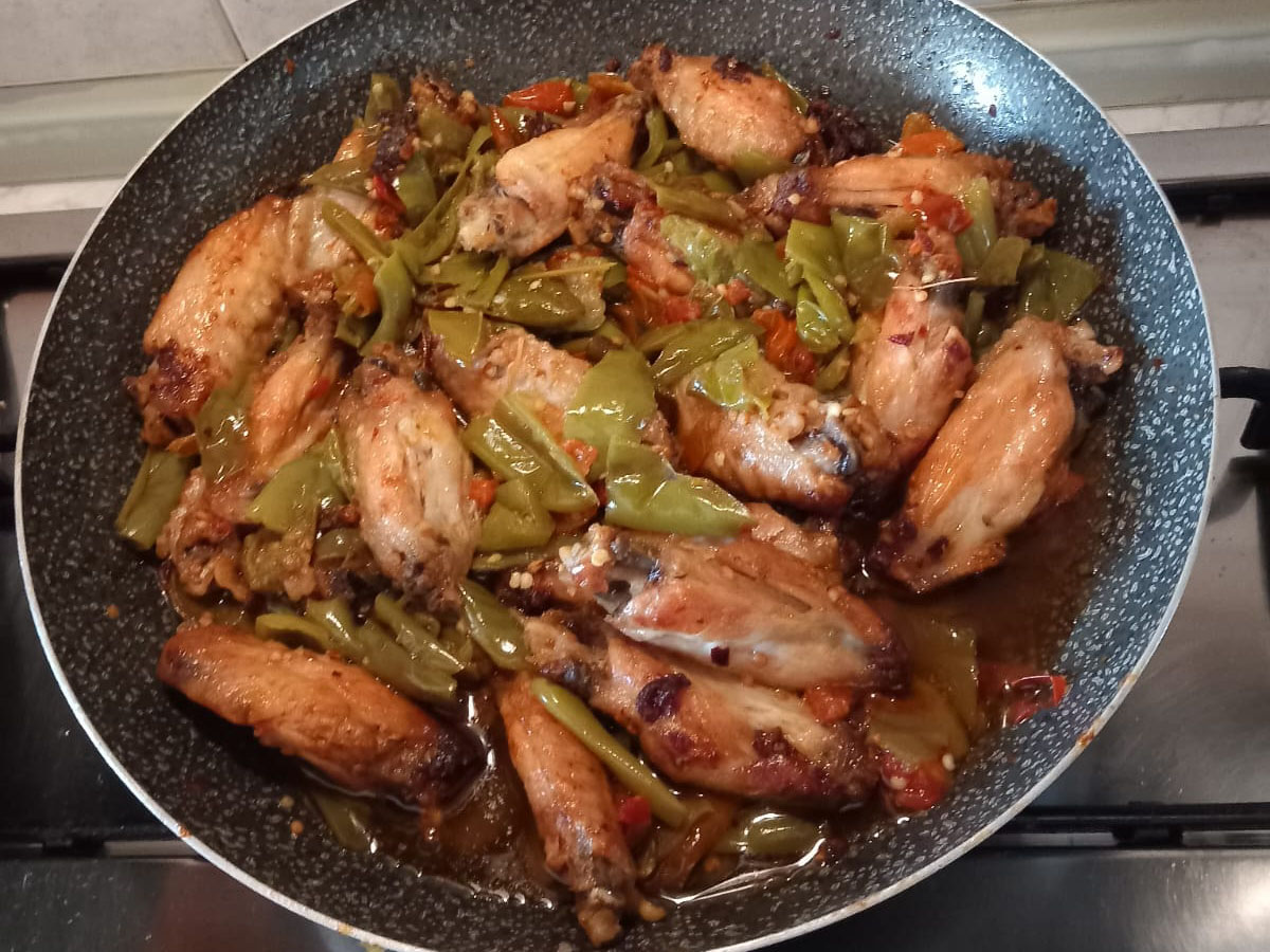 Dovete infatti farvi spazio in padella per adagiarle a contatto con la stessa, solo in questo modo si doreranno al punto giusto. Dopo qualche minuto giratele e fatele dorare anche dall’altro lato. Alzate la fiamma e sfumate con il vino. Quando la parte alcolica sarà evaporata, riabbassate la fiamma, coprite con un coperchio e lasciate cuocere per 18 minuti. Trascorso il tempo togliete il coperchio, aggiustate di sale e pepe e lasciate asciugare il liquido in eccesso. Fate riposare per 10 minuti prima di portare in tavola. Le vostre ali di pollo ai peperoni sono pronte. Buon appetito.