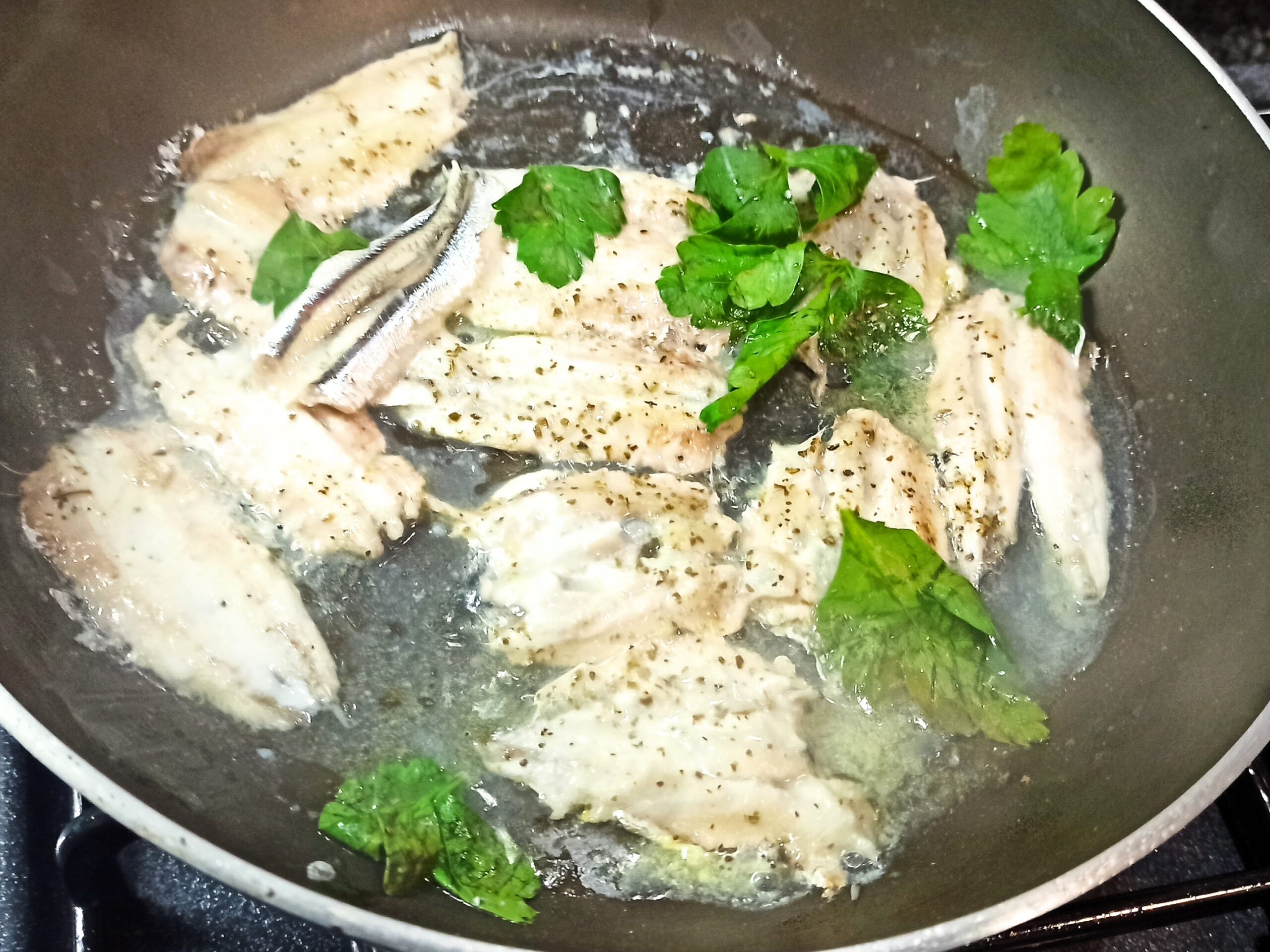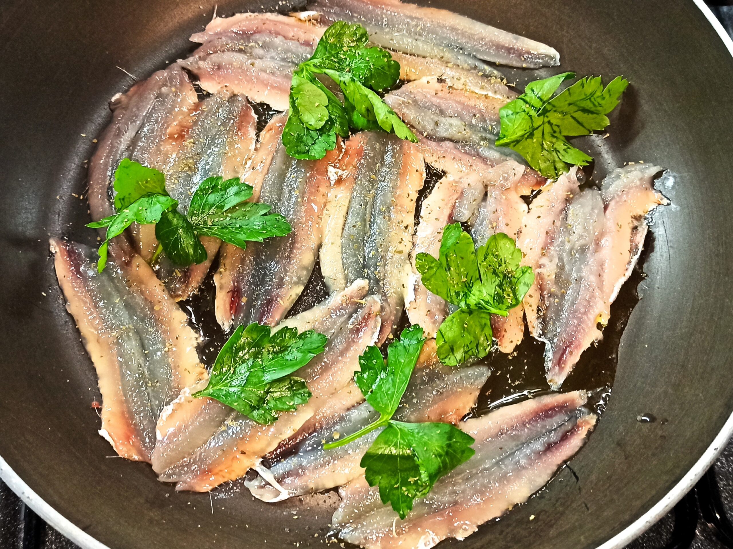 Disponete in una capiente padella i filetti, aggiungete lo spicchio d’aglio tagliato a pezzetti, il prezzemolo, l’olio evo, regolate di sale e profumate con l’origano.