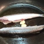 Per preparare l’aluzzo all’acqua pazza, iniziate a pulire il pesce. Per questioni di spazio, purtroppo ho dovuto eliminare la testa, ma se riuscite cuocete il pesce completo di testa. In una capiente padella, mettete un paio di giri abbondanti di olio evo, poi unite lo spicchio d’aglio diviso a metà, il pesce.