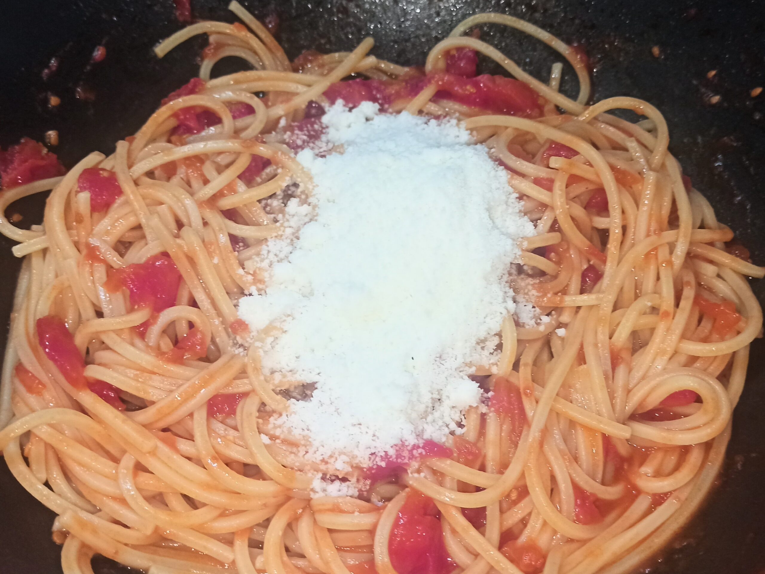 Cuocete la pasta al dente, e colatela direttamente nella padella. Spadellate a fuoco vivace per un paio di minuti, poi spegnete la fiamma e mantecate con il pecorino grattugiato.