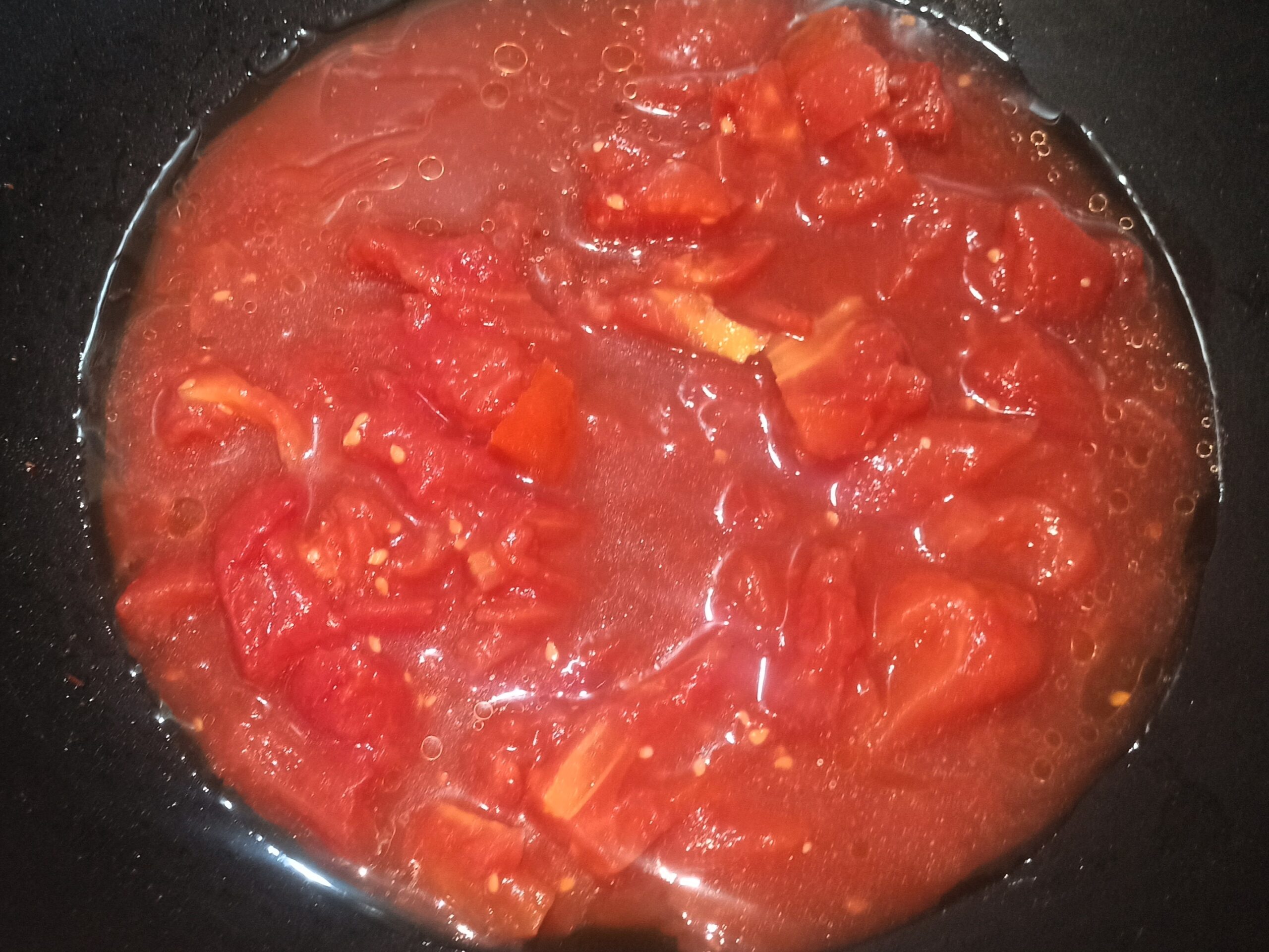 e aggiungete i pomodori schiacciati, regolate di sale, fate cuocere per dieci minuti.