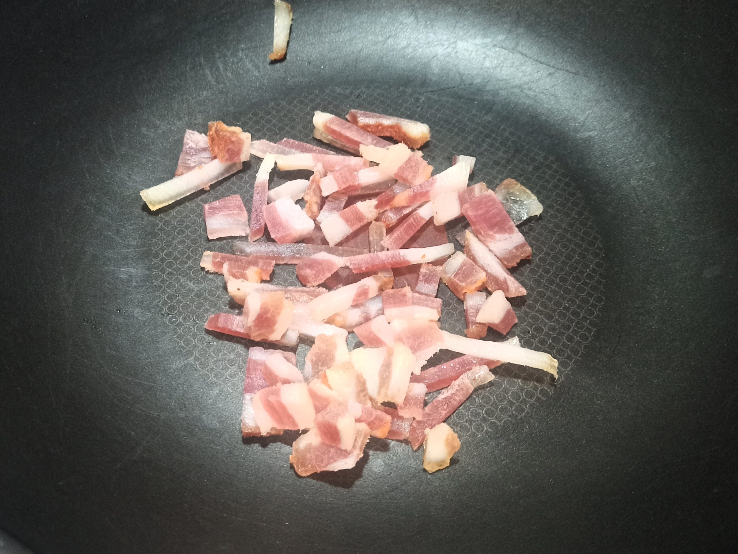 appena il guanciale inizia a sciogliersi, sfumate con il vino bianco. Fate evaporare l’alcol, mettete da parte un pò di guanciale croccante che vi servirà per guarnire il piatto,