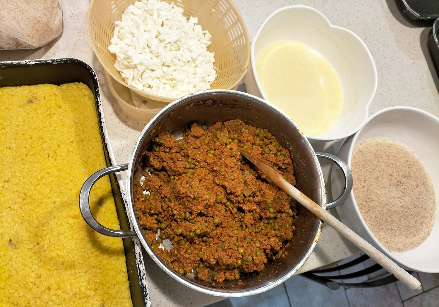 - Per il Ripieno (Ragù): 200 g macinato di vitello, misto per soffritto (cipolla, carota, sedano), piselli q.b., salsa di pomodoro q.b., 1 dado, noce moscata, olio EVO.