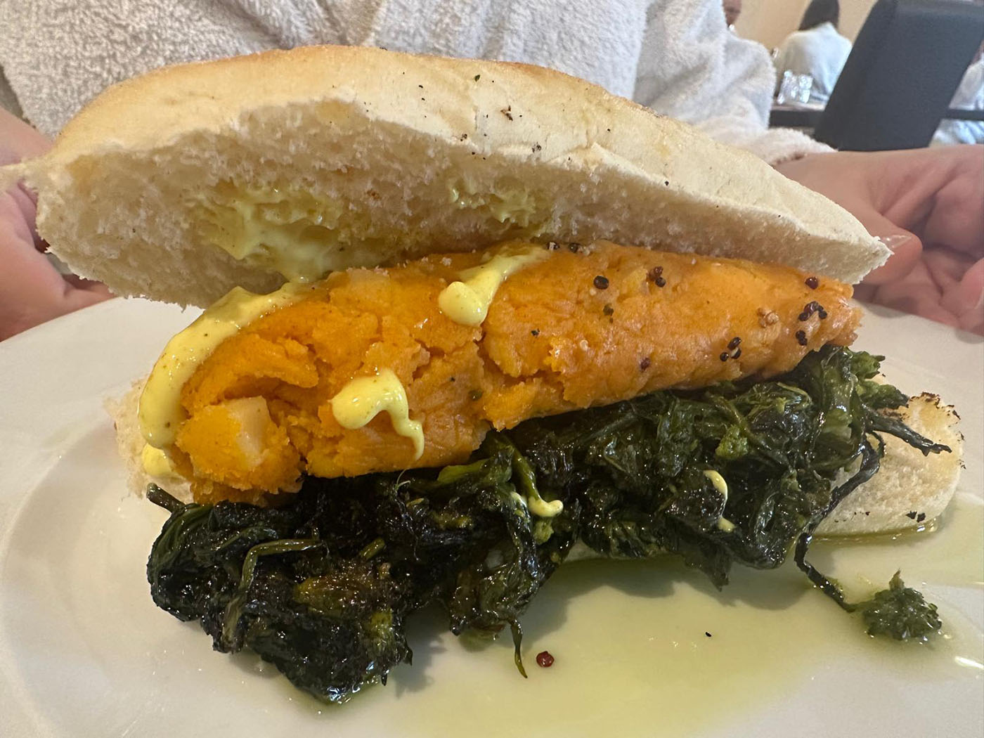 Infine Assemblaggio del panino. Scaldare il pane sulla griglia o nel forno per qualche minuto. Spennella l’interno con un filo d’olio e un pizzico di sale. Spalma la crema di zucca sulla base del pane. Aggiungere i friarielli saltati. Adagia sopra l’hot dog di seppia croccante. Completare con un filo di salsa di maionese e limone.
