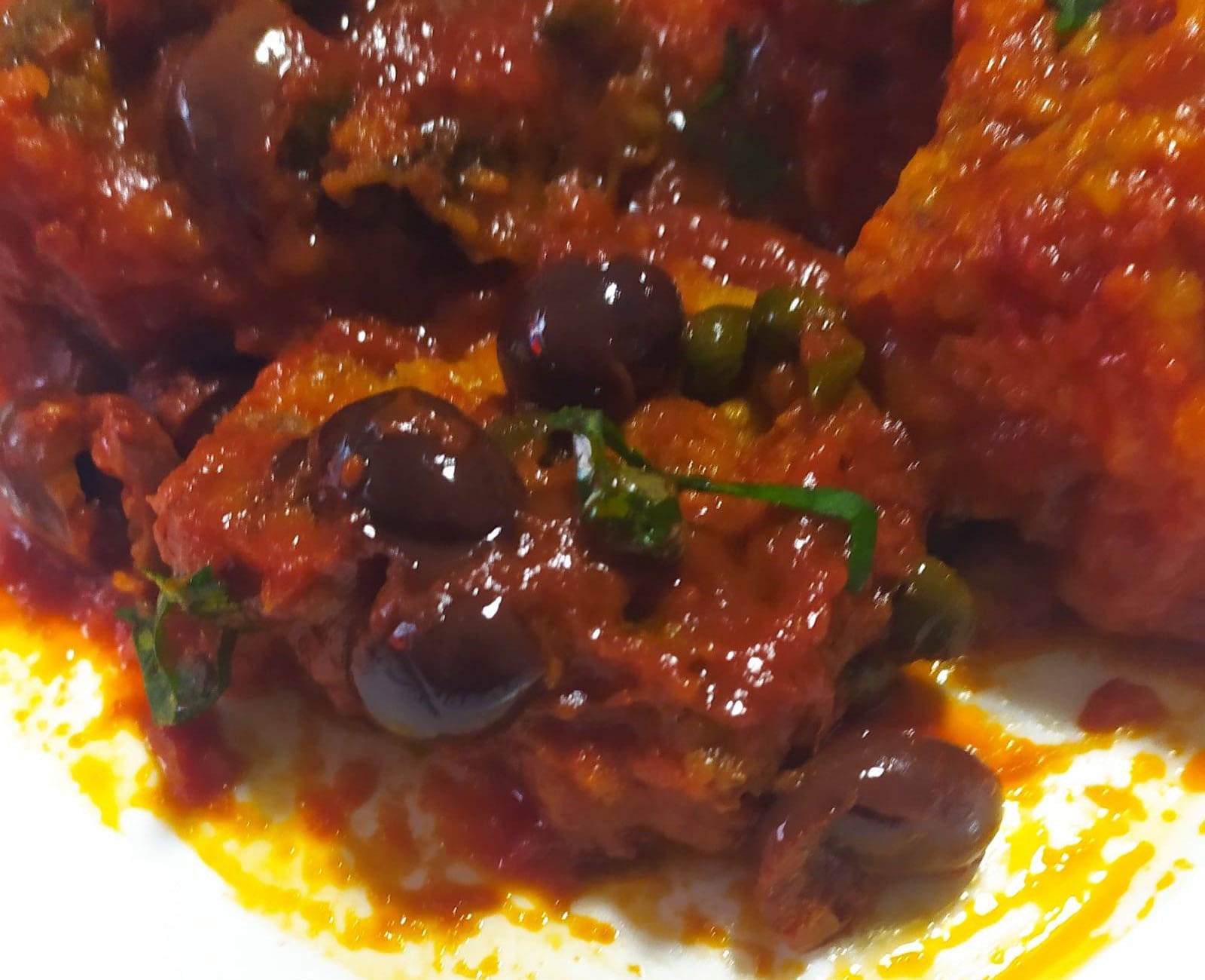 Sciacquate i capperi dal sale, asciugateli e aggiungeteli alla passata di pomodoro. Aggiungete anche i pinoli, le olive, l’uvetta scolata e un pizzico di sale. Lasciate cuocere per alcuni minuti, poi unite il baccalà fritto e le patate lessate. Fate cuocere il tutto il tempo necessario affinché il baccalà si insaporisca bene, facendo attenzione a non rompere i pezzi. Infine, impiattate e servite. Buon appetito!