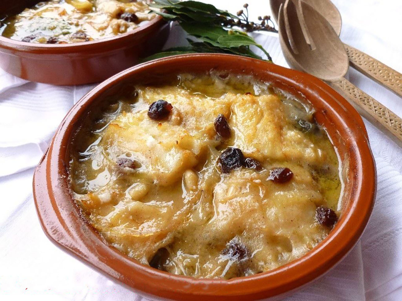 Lasciate cuocere un paio di minuti e infine versate anche i pinoli, l’uvetta ( che avrete fatto prima ammollare in acqua calda per qualche minuto) le foglie di alloro e il latte. Lasciate tutto in cottura per altri 10 minuti a fiamma media. Prendete a questo punto la pirofila dove avevate messo la polent e adagiatevi sopra il baccalà con il condimento. Spolverate sopra una bella dose di pan grattato e mettete in forno a gratinare per circa 5 minuti. Il nostro Baccalà alla cappuccina è pronto per essere servito bello caldo. Buon appetito!