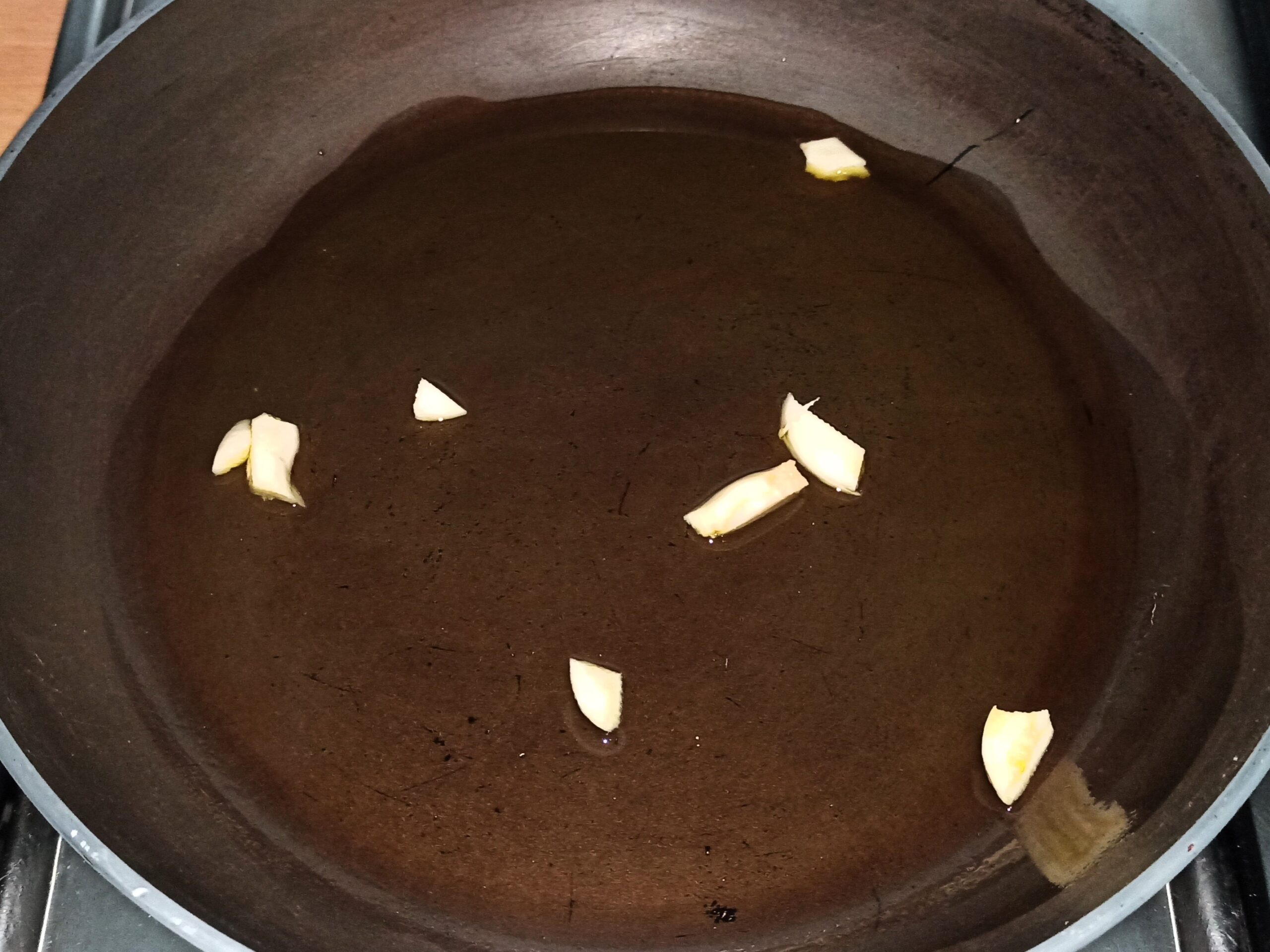 In una capiente padella, mettete un paio di giri abbondanti di olio evo, aggiungete gli spicchi d’aglio tagliati, e fateli imbiondire a fiamma media.