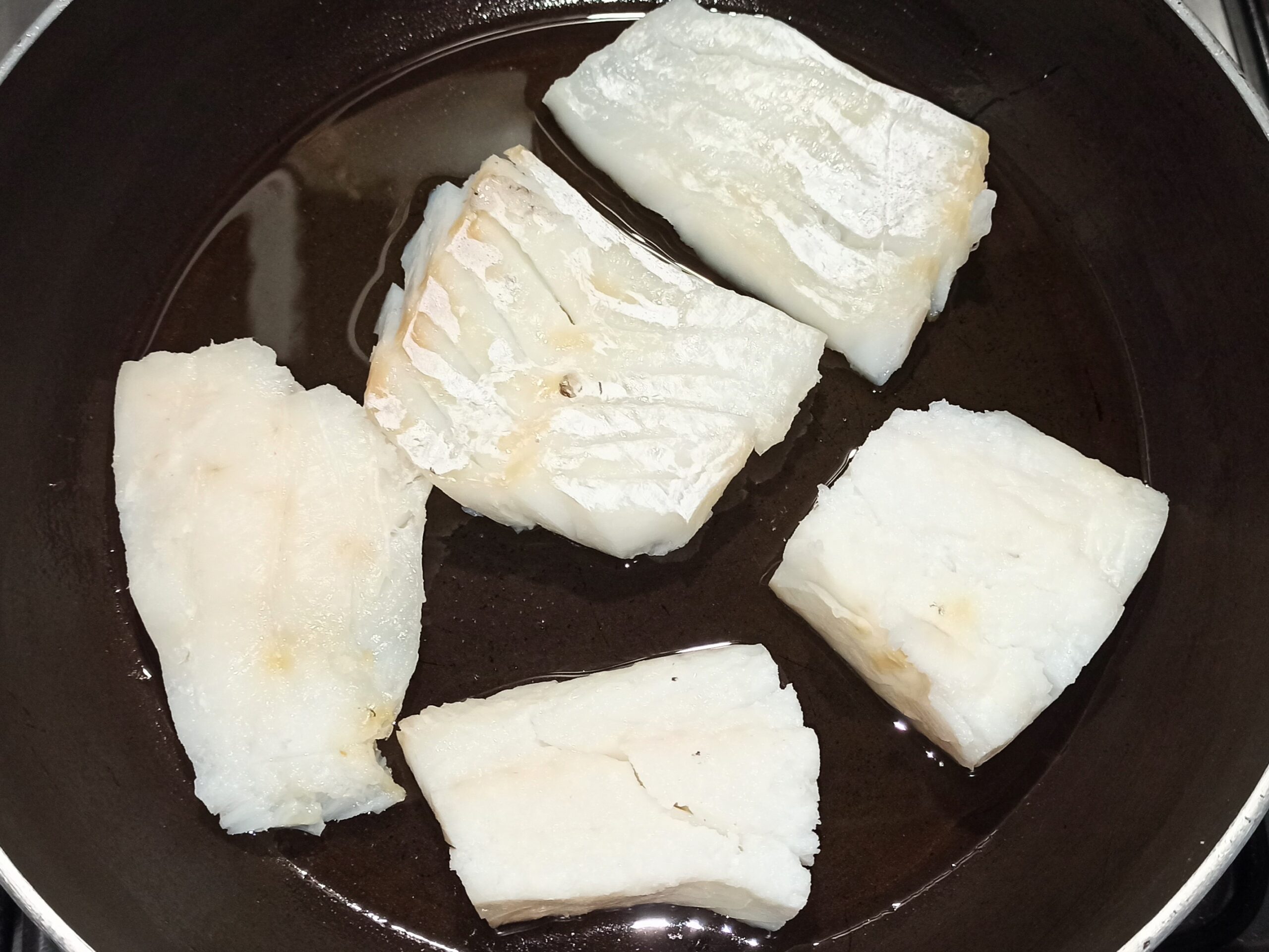 Eliminate l’aglio dall’olio, portatelo nuovamente a temperatura, e aggiungete il baccalà, che andrà solo riscaldato, non fritto.