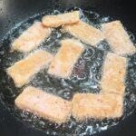 Versate l’olio di semi in una capiente padella, portatelo a temperatura, e friggete le fette di prosciutto cotto.