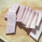 Per preparare i bastoncini di prosciutto cotto, iniziate a ricavare del prosciutto cotto delle fettine spesse circa mezzo centimetro e lunghe otto.