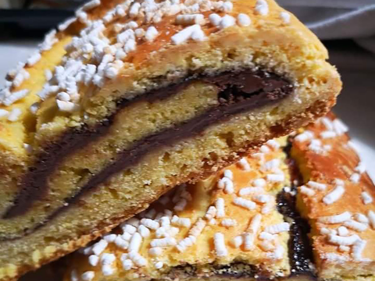 Farcite l’impasto uniformemente con la crema al cioccolato e le nocciole. Aiutandovi con un altro foglio di carta da forno, ripiegate l’impasto facendo tre pieghe, quindi sigillate bene i bordi. Trasferite il rotolo in una teglia precedentemente foderata con carta da forno, e praticate un leggero taglio centrale sull’impasto. Spennellate la superficie del dolce con un tuorlo d’uovo leggermente sbattuto.