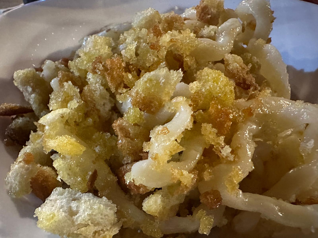 Ora bisogna Cuocere i bigoli: Cuocete i bigoli in abbondante acqua salata, seguendo i tempi indicati sulla confezione, e scolateli al dente. Versate i bigoli direttamente nella padella con le briciole, riaccendete il fuoco basso e mescolate bene per distribuire il condimento su tutta la pasta. Impiattate i bigoli e completate con una spolverata di prezzemolo fresco tritato. Se desiderato, aggiungere un filo d’olio a crudo per esaltare il sapore. Per una variante più ricca, potete aggiungere del peperoncino per un tocco piccante