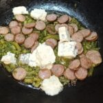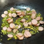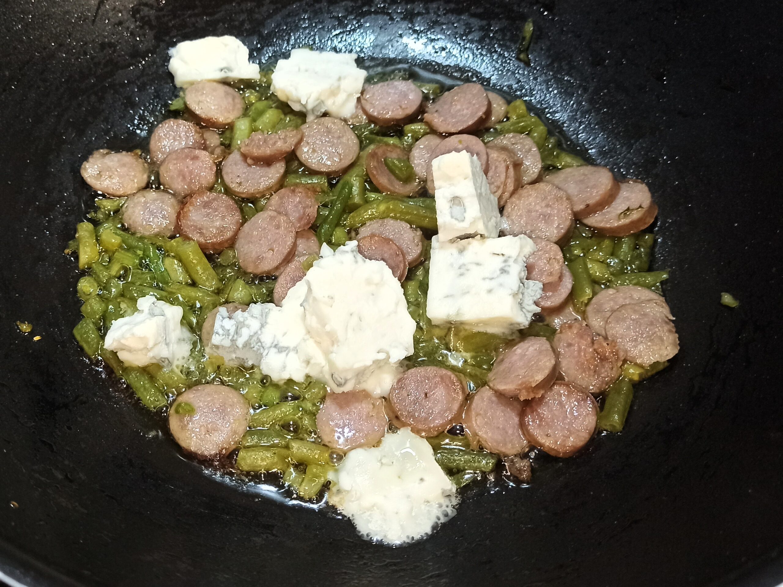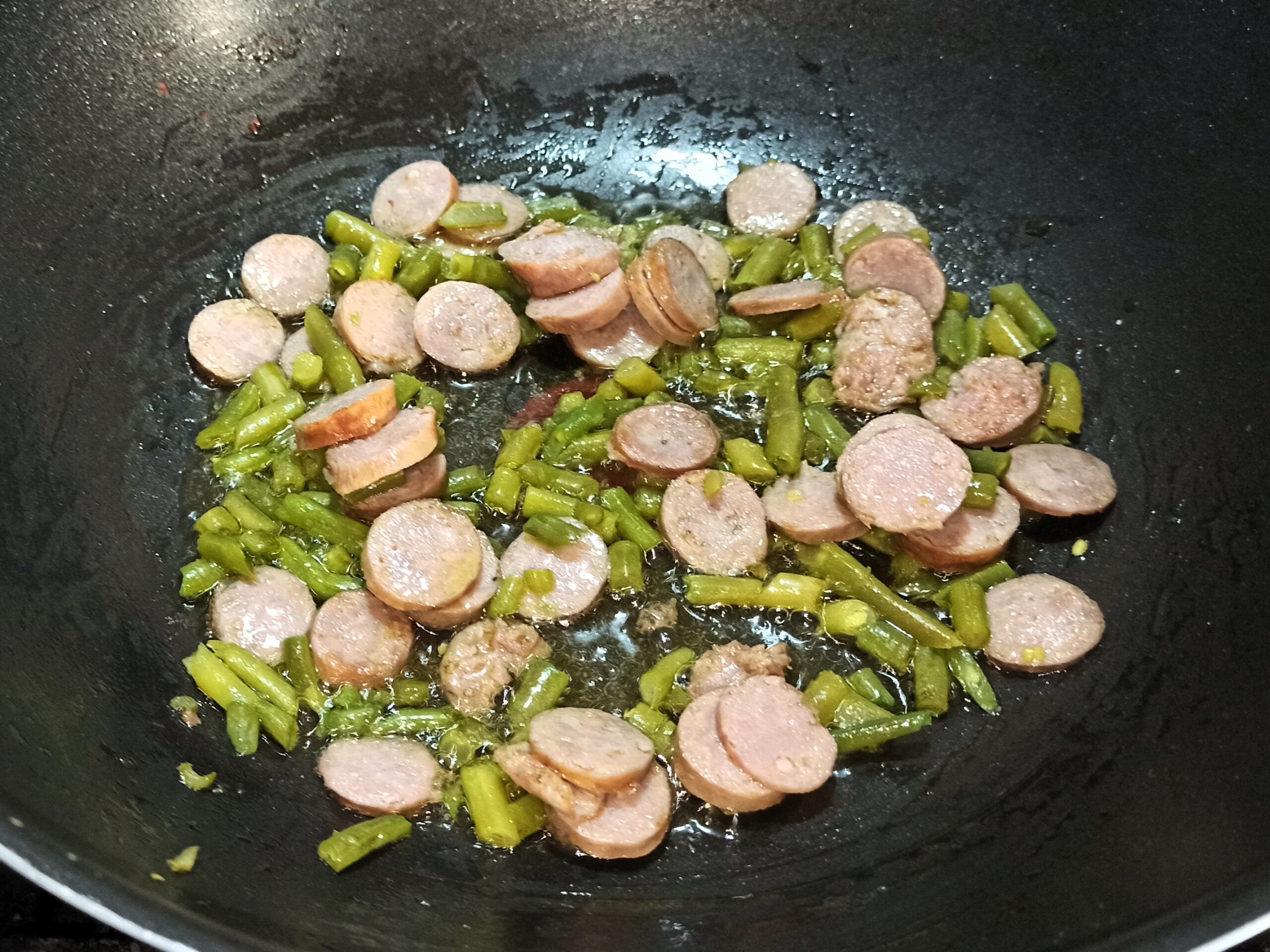 In una capiente padella mettete un giro d’olio evo, aggiungete la salsiccetta ed i fagiolini, fate sfrigolare per un minuto a fiamma dolce, poi aumentate la fiamma e sfumate con il vino bianco.
