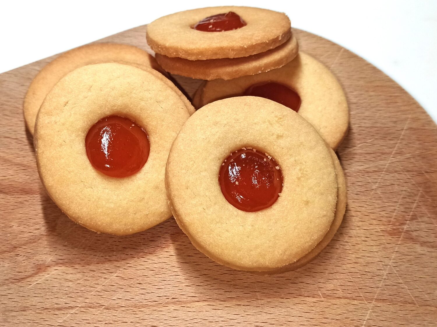 Trascorso il tempo di riposo, con l’aiuto di un mattarello, stendete una sfoglia dello spessore di circa mezzo centimetro. Con un coppapasta ricavate dei cerchi, poi stendete nuovamente l’impasto che avanza e ricavate altri cerchi. Con un coppapasta di diametro inferiore, forate al centro metà dei cerchi. Posizionateli su una leccarda foderata con carta forno. Cuocete per circa quindici minuti, in forno preriscaldato a 180°, sfornateli e fateli raffreddare completamente su una gratella. Spalmate la marmellata sui cerchi interi e ricopriteli con quelli forati, potete spolverizzarli con dello zucchero a velo, oppure lasciarli così al naturale.