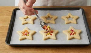 Le Forme: Stendete la frolla (spessore circa 4-5 mm). Ritagliate i biscotti con uno stampino grande (es. stella o albero). Poi, con uno stampino più piccolo, rimuovete la parte centrale creando una “finestra” vuota.