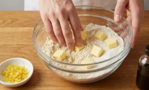 La Sabbiatura: In una ciotola (o nel mixer) unite farina, zucchero e il burro freddo a pezzetti. Lavorate velocemente con la punta delle dita fino a ottenere un composto “sabbioso”. Questo passaggio è fondamentale per la friabilità.