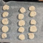 Posizionate biscotti zuccherini con granella di nocciole, in una teglia foderata da carta forno.