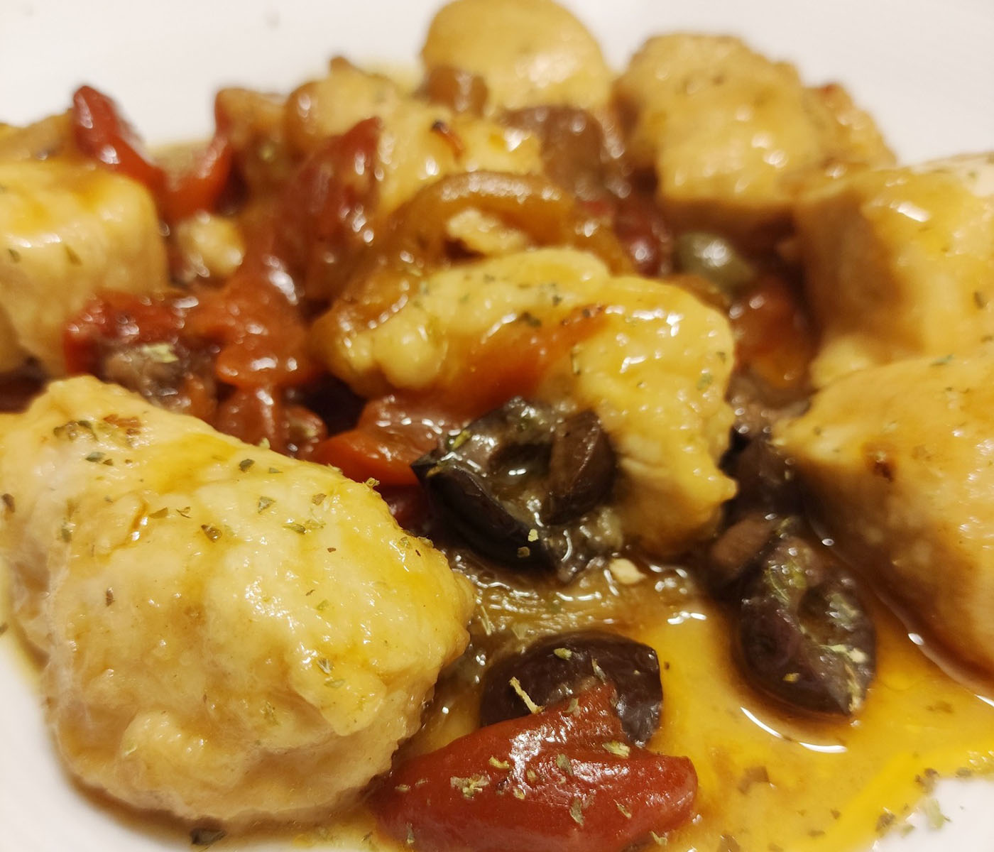 Bocconcini di pollo paesano cilentano con peperoni grigliati, olive di Gaeta e capperi. Un secondo piatto rustico, profumato e ricco di gusto! Ci sono piatti che raccontano il territorio, i suoi colori e i suoi sapori autentici. Questo pollo, preparato con ingredienti semplici e intensi come i peperoni grigliati, le olive nere di Gaeta e i capperi, è un inno alla cucina del Cilento e delle terre campane. Un piatto “paesano”, nel senso più bello del termine: casalingo, schietto, saporito e pieno d’amore. Perfetto per un pranzo della domenica o per una cena in cui vuoi portare in tavola un pezzetto di Sud, con tutti i suoi profumi mediterranei.