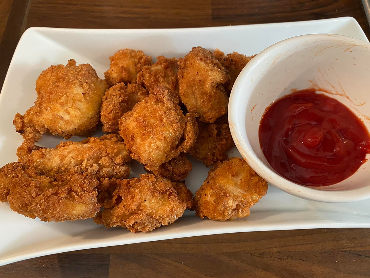 Mettiamo il pangrattato in una pirofila, lasciamo cadere i pezzetti di pollo e poi amalgamiamo con le mani per bene facendo aderire bene il pangrattato, li mettiamo in un tagliere. Poi versiamo abbondante olio in una padella e quando arriva alla giusta temperatura friggiamo i pezzi di pollo a fuoco medio basso, 5 o 6 minuti girandoli, fino a quando diventano dorati. Li ritiriamo e adagiamo in un piatto in carta assorbente. Si possono accompagnare con salsettine varie: ketchup, maionese, yogurth o salsette asiatiche. Buon appetito!