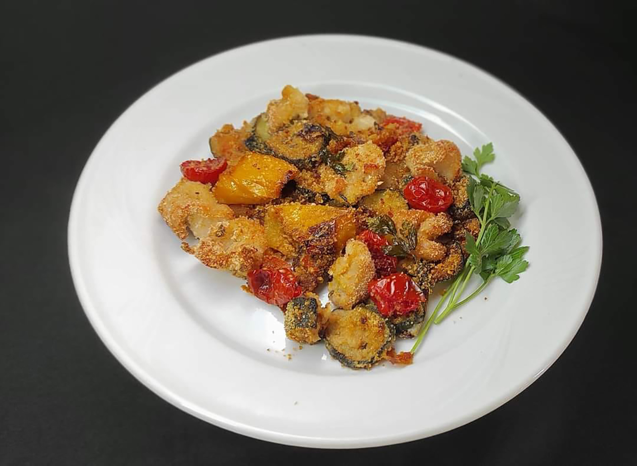 Mescolate per farlo attaccare bene e mettete il tutto su una teglia da forno precedentemente rivestita da carta forno, oppure anche unta con un po’ di olio. Dopo aver posizionato le verdure mettete anche i bocconcini di tacchino o pollo quello che avete, ovviamente anche questo va passato nella panatura aromatica, e per l’ultimo mettete qualche pomodorino Qua e la tagliato in due. Coprite il tutto con la panatura restante, un giro di olio di oliva, qualche foglia prezzemolo e infornate. Forno statico 180° per 25/30 minuti ultimi 2/3 minuti con forno ventilato.