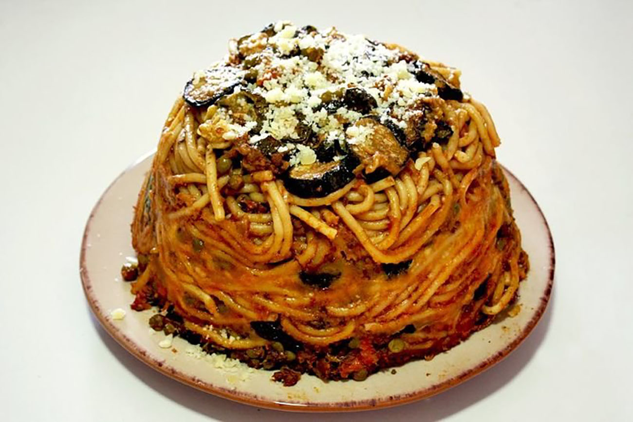 Mettiamo la pentola per i bucatini, riempiamola d’acqua e facciamo cuocere la pasta. Una volta che bolle aggiungete il sale. Una volta che la pasta è cotta versiamola in una ciotola e condiamo con il ragù che abbiamo preparato. Imburrate poi lo stampo ( quello con il cono al centro) e cospargete di pan grattato. Formate un letto di zucchine ( fritte, cotte in precedenza) completate con i bucatini avanzati, pangrattato e pecorino grattugiato. In ultimo infornate a 180 gradi per una trentina di minuti. Una volta cotto aspettate una trentina di minuti prima di toglierla dallo stampo e trasferirla in un piatto.