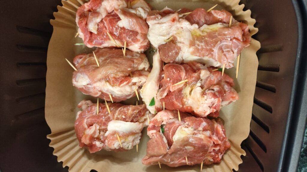 Prepara la farcitura: taglia il formaggio a bastoncini o cubetti. Se vuoi un sapore più intenso, mescolalo con prezzemolo tritato e una macinata di pepe. Farcisci le fettine: adagia al centro di ogni fettina un pezzetto di formaggio. Arrotola a involtino e chiudi con uno stecchino o infilza più bombette su uno spiedino. Se vuoi, avvolgi ogni bombetta con una fettina sottile di pancetta. Spennella con un filo d’olio (opzionale, per renderle ancora più dorate). Cuoci in Friggitrice ad aria: disponi le bombette nel cestello senza sovrapporle. Cuoci a 200°C per 12-15 minuti, girandole a metà cottura, fino a doratura e formaggio filante.