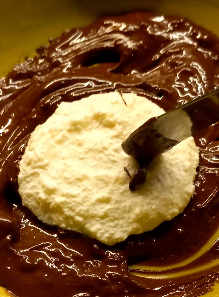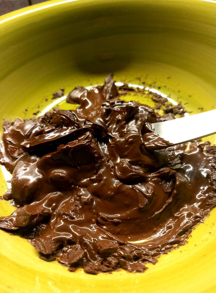- Sciogliete il cioccolato fondente insieme al burro (se lo usate) a bagnomaria o nel microonde a bassa potenza, mescolando ogni 30 secondi.