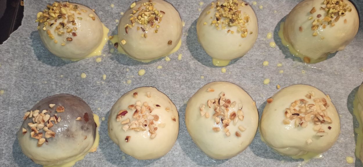 Infornate in forno preriscaldato a 180°, per venti minuti. Il tempo di cottura, può variare a secondo del tipo di forno. Sfornate, lasciate intiepidire e gustate le vostre briosce ripiene.