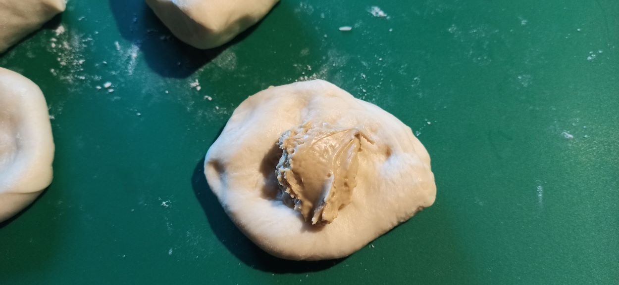 coprite con della pellicola, fate riposare per un’ora. Trascorso il tempo di riposo, dividete l’impasto, in tanti pezzetti, del peso a voi gradito. Formate delle sfere, schiacciatele, e al centro di ognuna, mette un cucchiaino di crema.