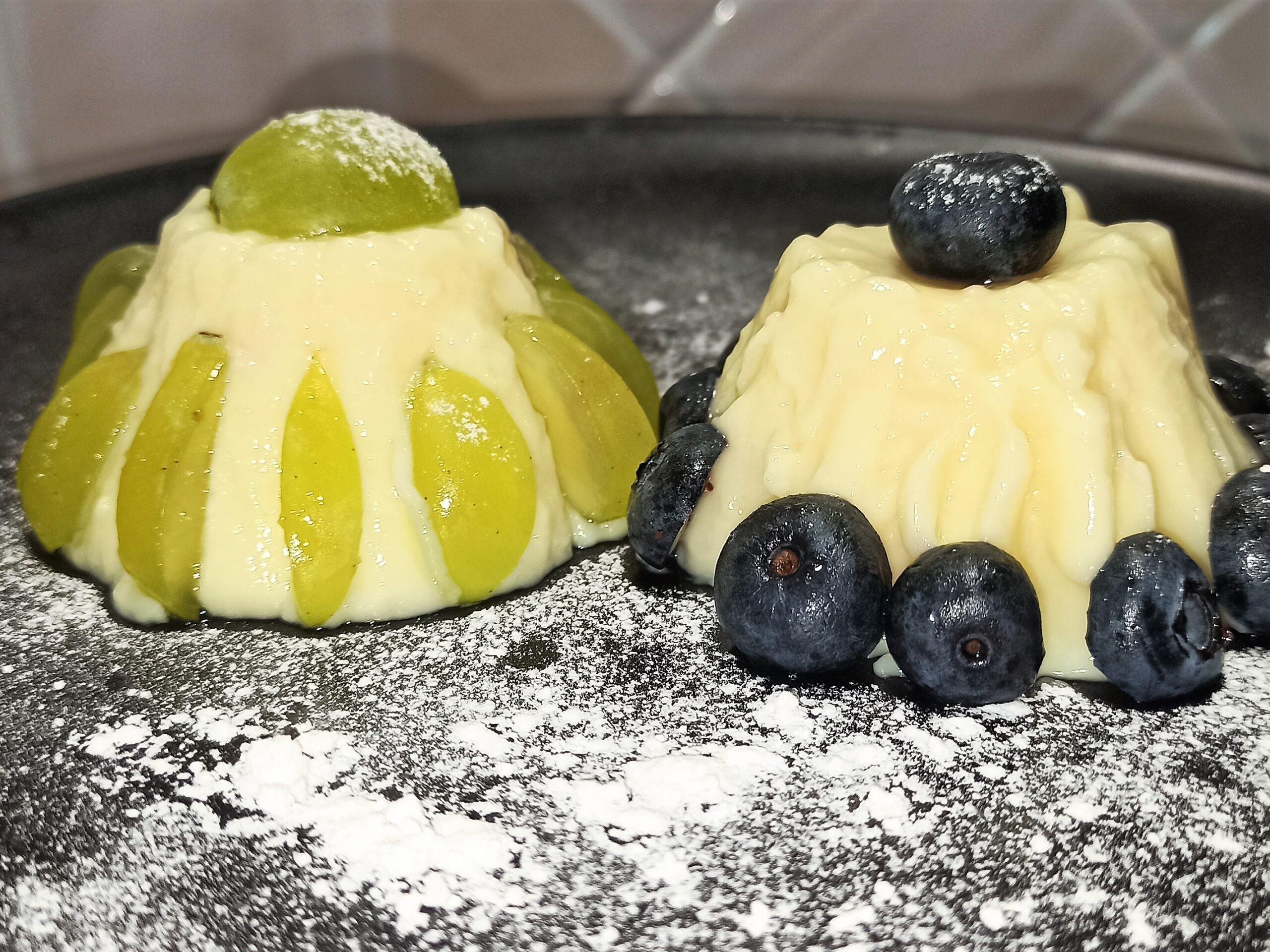 Spegnete la fiamma, e dividete la crema negli appositi stampini, fateli raffreddare prima a temperatura ambiente, e poi per almeno tre ore in frigo. Sformate i budini e prima di servirli, guarniteli a piacere, io ho usato uva e mirtilli, potete diversificare la frutta, oppure servirli al naturale, oppure con granella di nocciole.