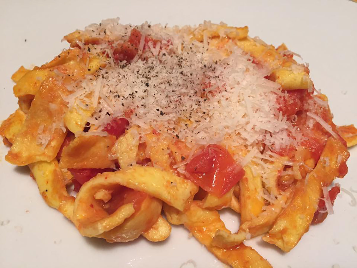 Vi basterà preparare una frittata, tagliarla a strisce e condirla con pancetta e pomodoro. Il risultato è una squisitezza, un altro modo di cucinare le uova davvero particolare, soprattutto un pasto completo.