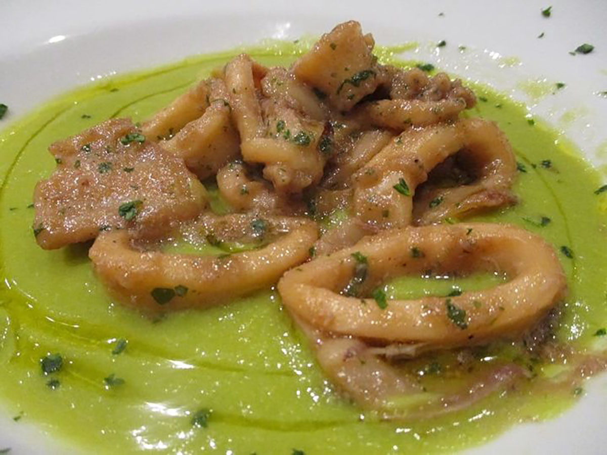 Calamari su letto di crema di piselli: