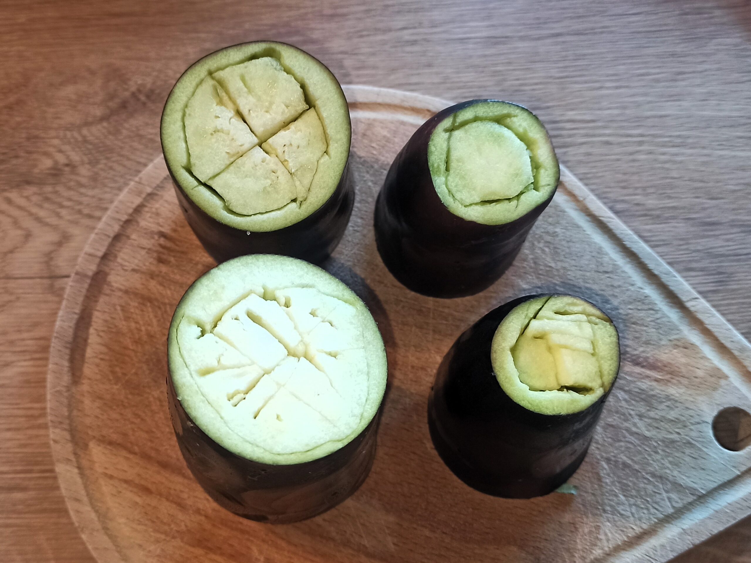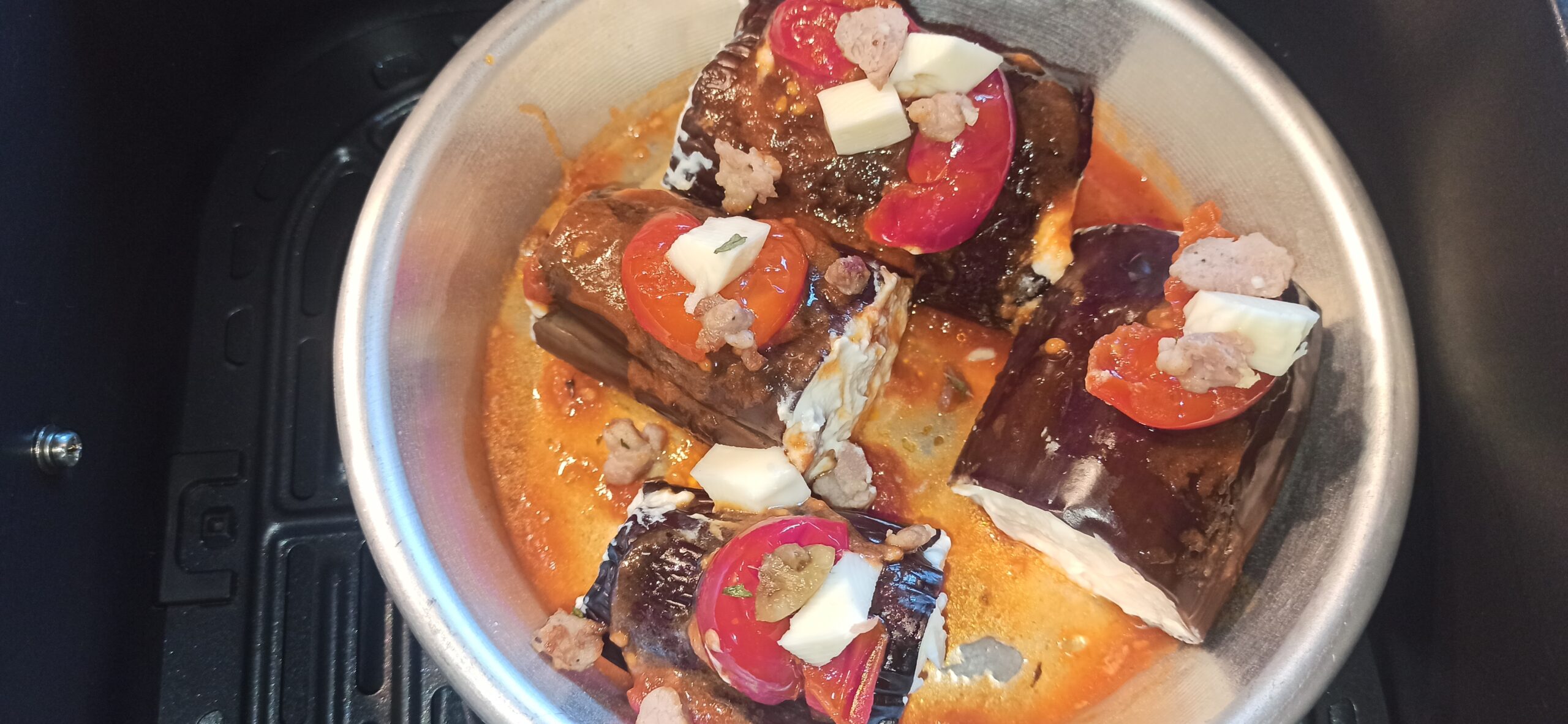 Per preparare i cannelloni di melanzane, iniziate a lavare ed asciugare le melanzane, Eliminate le due estremità, e dividetele a metà, oppure in tre parti, a secondo della grandezza, e/o dalle dimensioni dei cannelloni. Incidete la parte interna, cospargetela con poco olio, e fatela cuocere in forno e/o friggitrice ad aria, a 180° per dieci minuti.