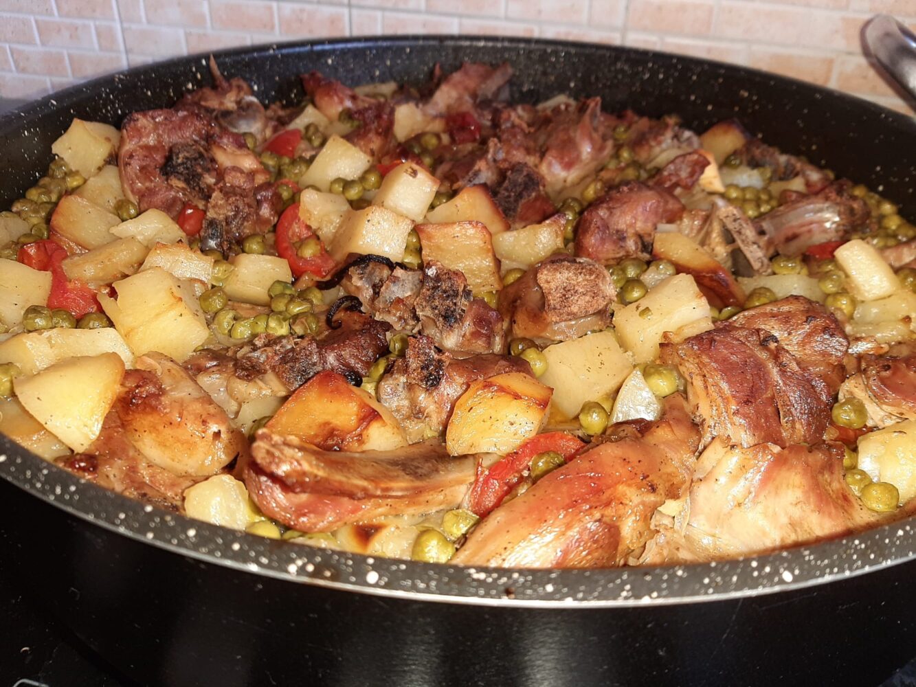 Ogni 20–30 minuti girate i pezzi di capretto, irrorandoli con il fondo per mantenerli succosi e dorarli uniformemente.