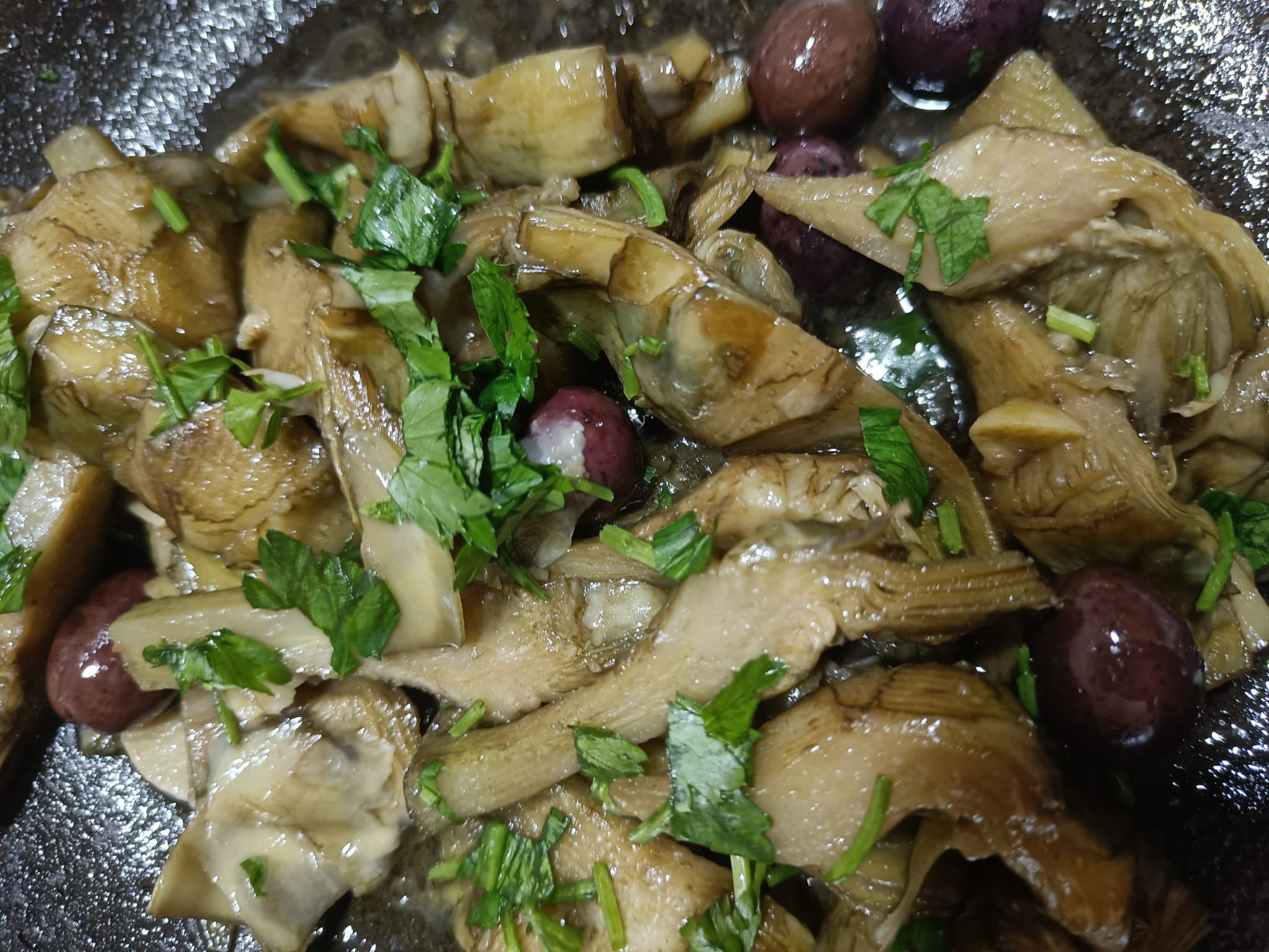 Coprite per metà la padella con il coperchio e lasciate stufare a fuoco dolce per almeno 20 o 30 minuti a seconda della quantità di liquido aggiunto. Eliminate l’aglio. Quando il fondo si è quasi completamente assorbito aggiungete le olive nere e i capperi dissalati. Fate cuocere per 5 minuti, cospargete con il prezzemolo tritato e servite. I vostri carciofi affogati sono pronti. Se non avete voglia di cucinarli, potete sempre assaggiarli in osteria.