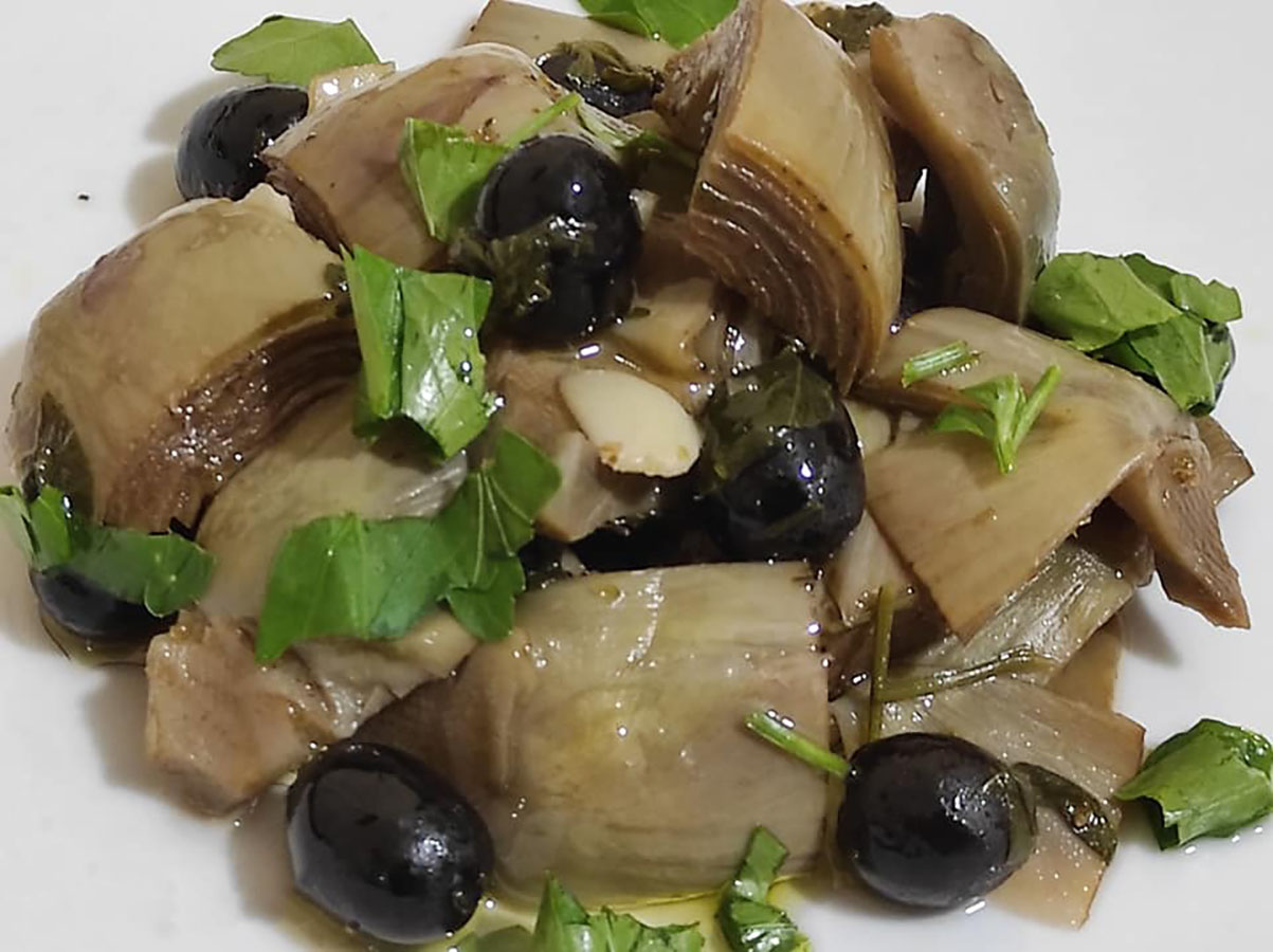 Successivamente, tagliate i cuori di carciofo a spicchi e metteteli nella ciotola con acqua e succo di limone, quindi procedete a pulire gli altri carciofi. Scaldate dell’olio in un tegame, aggiungete sale, aglio e peperoncino a pezzetti, facendoli soffriggere. Aggiungete le olive e i capperi, cuocendo per circa 2 minuti.