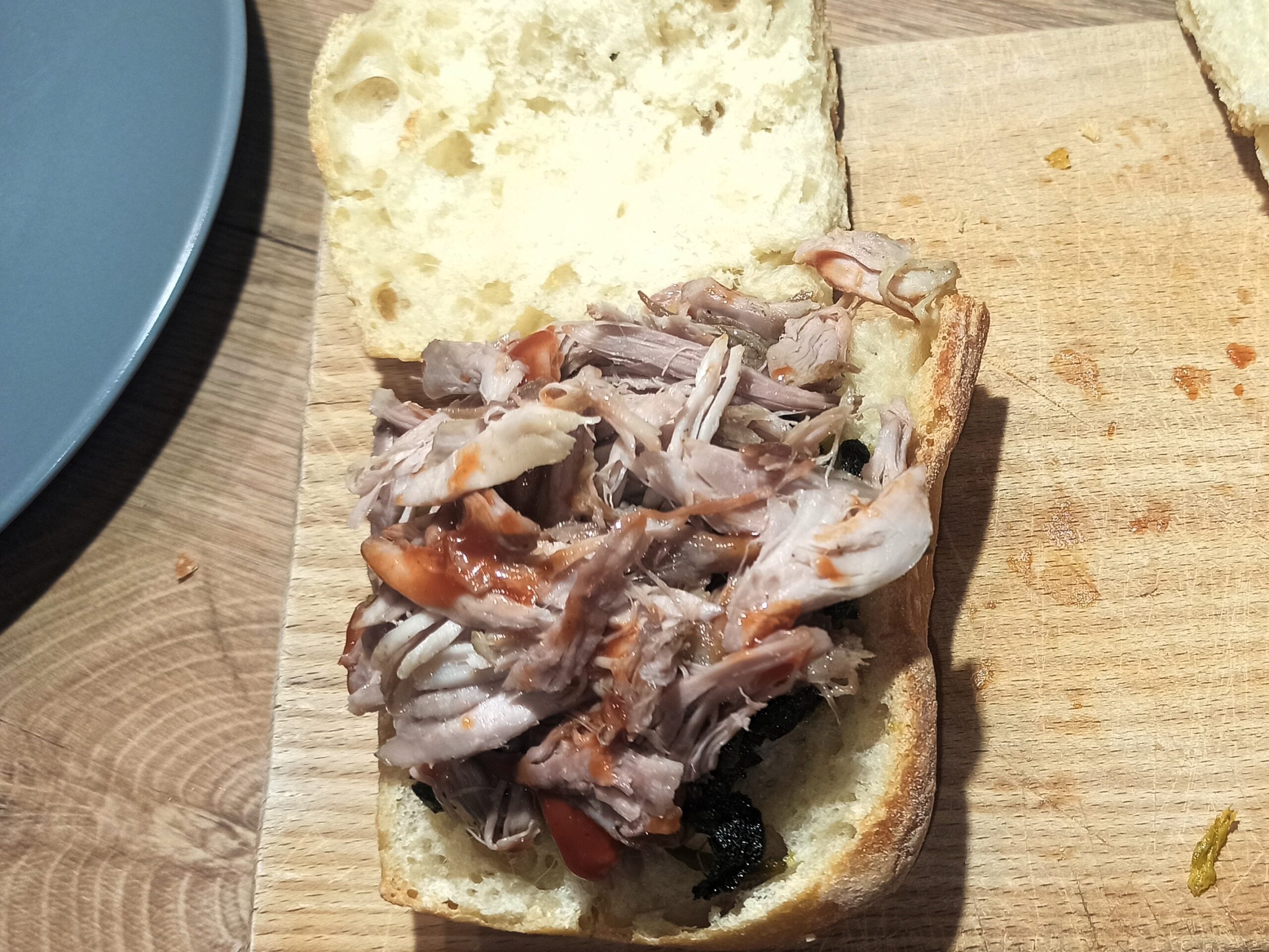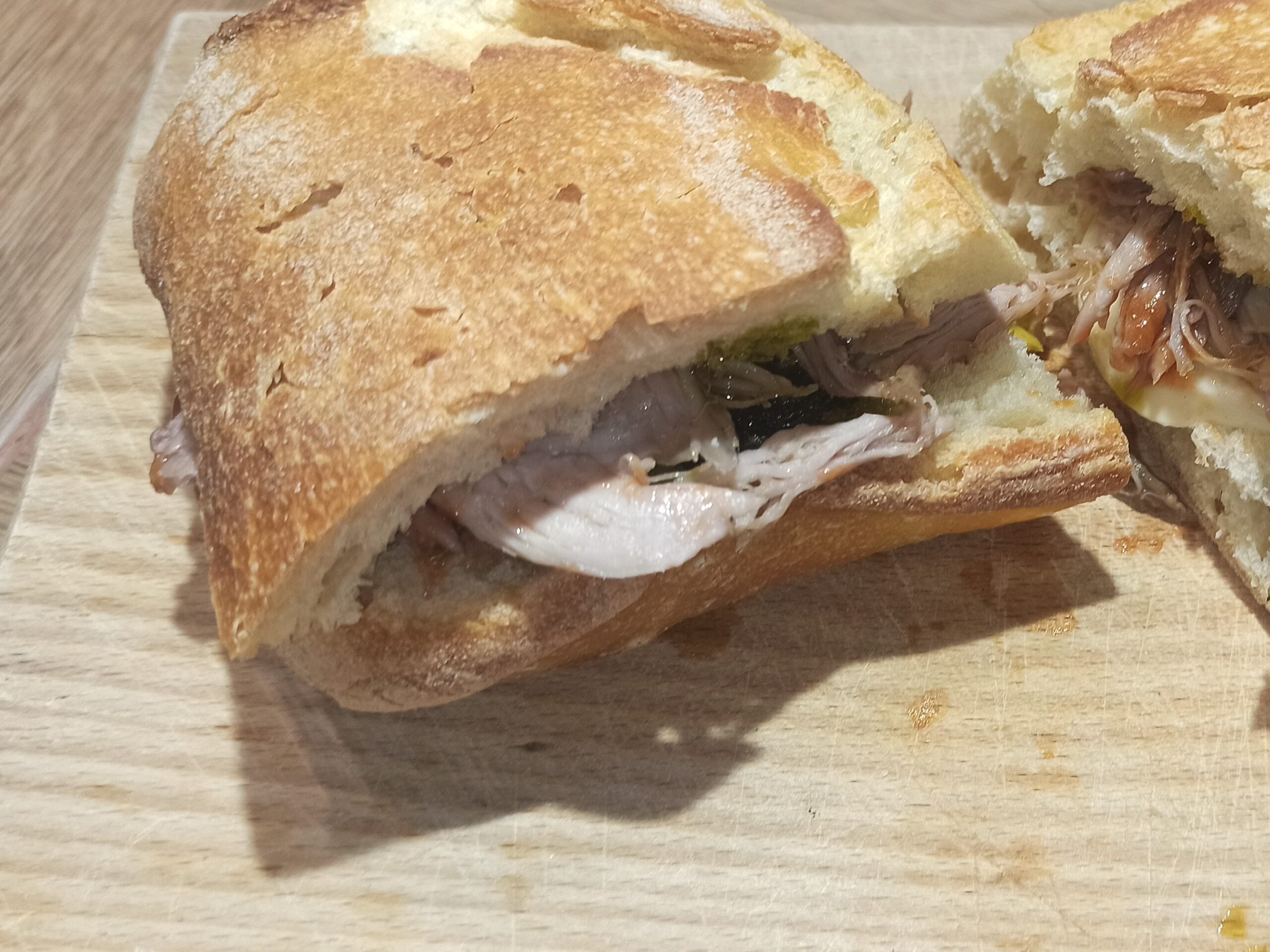 Il pulled pork, è una ricetta tutta americana, preparata con la spalla di maiale, marinata in spezie e poi cotta per molto tempo a bassa temperatura con un barbecue. Non avendo a disposizione un barbecue, potete utilizzare il forno casalingo, oppure, come ho fatto io, potete optare per una lunga cottura, in pentola a fuoco lento. Il risultato finale dovrà essere un pezzo di carne morbidissimo, facile da sfilacciare utilizzando due forchette. Potete servire il vostro maiale sfilacciato al piatto, accompagnato da salsa barbecue, o altre salse di vostro gradimento. Ma adesso vediamo insieme come preparare la versione italiana del Pulled Pork, ovvero la carne di maiale sfilacciata. Come taglio di carne, potete utilizzare un pezzo di spalla, io avevo a disposizione come taglio la gallinella. La gallinella di maiale è un taglio di carne prelevato dalla sovra coscia del maiale, ha dato ottimi risultati.