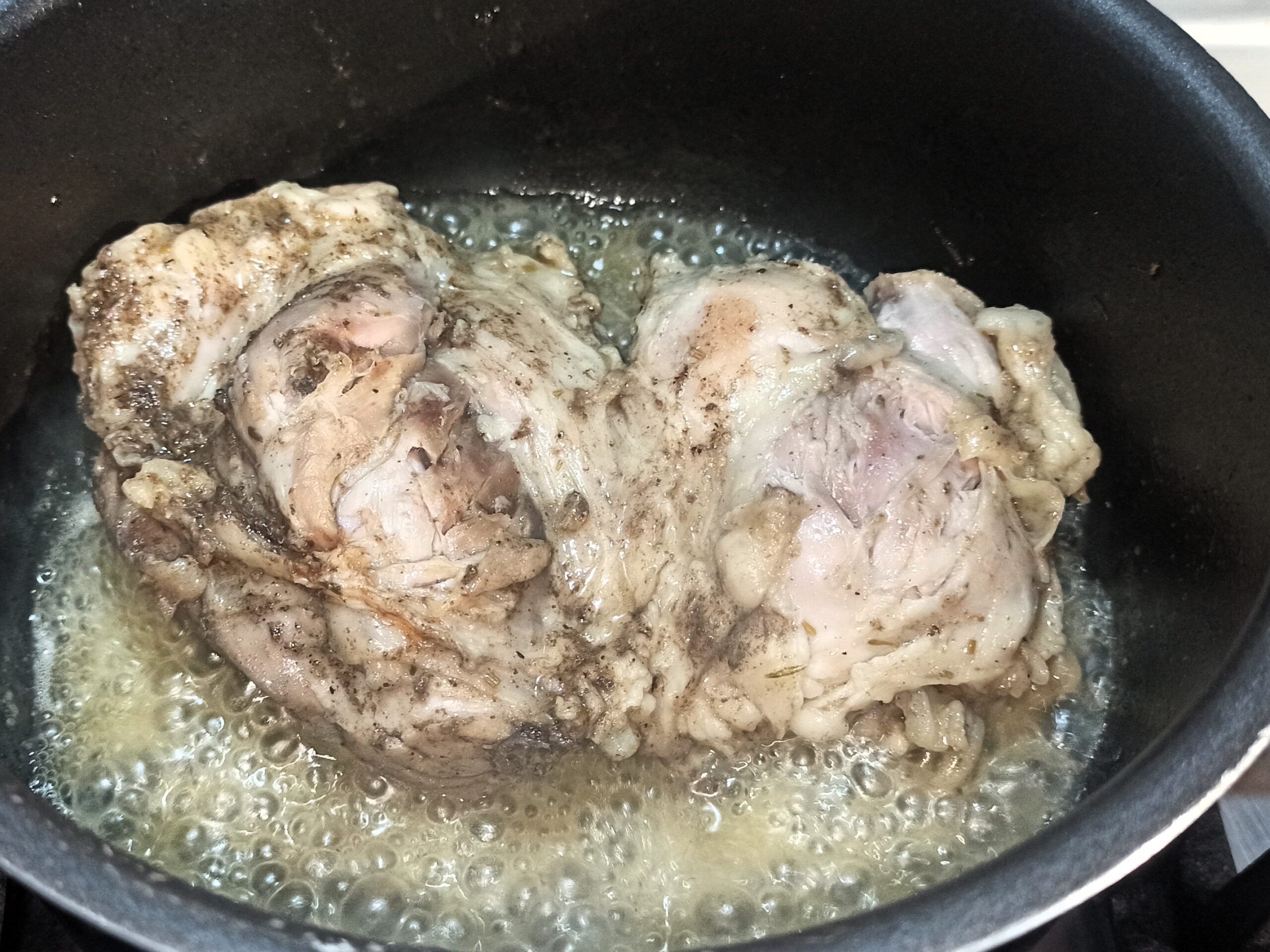 Sciogliete nell’acqua il sale e lo zucchero, ricoprite la carne, e mettetela a riposare per sei ore in frigo. Trascorso il tempo di riposo, eliminate la marinatura, mettete la carne in un pentolino, aggiungete un poco d’acqua, un filo d’olio, e iniziate a cuocere a fiamma bassa, con il pentolino coperto, Cercate di utilizzare quei coperchi con il foro, in modo da fare uscire un poco di vapore, altrimenti dovete posizionare il coperchio leggermente sfalsato rispetto alla superfice del pentolino. Controllate e girate spesso la carne, mi raccomando l’acqua, durante la fase di cottura, non dovrà mai asciugarsi del tutto.
