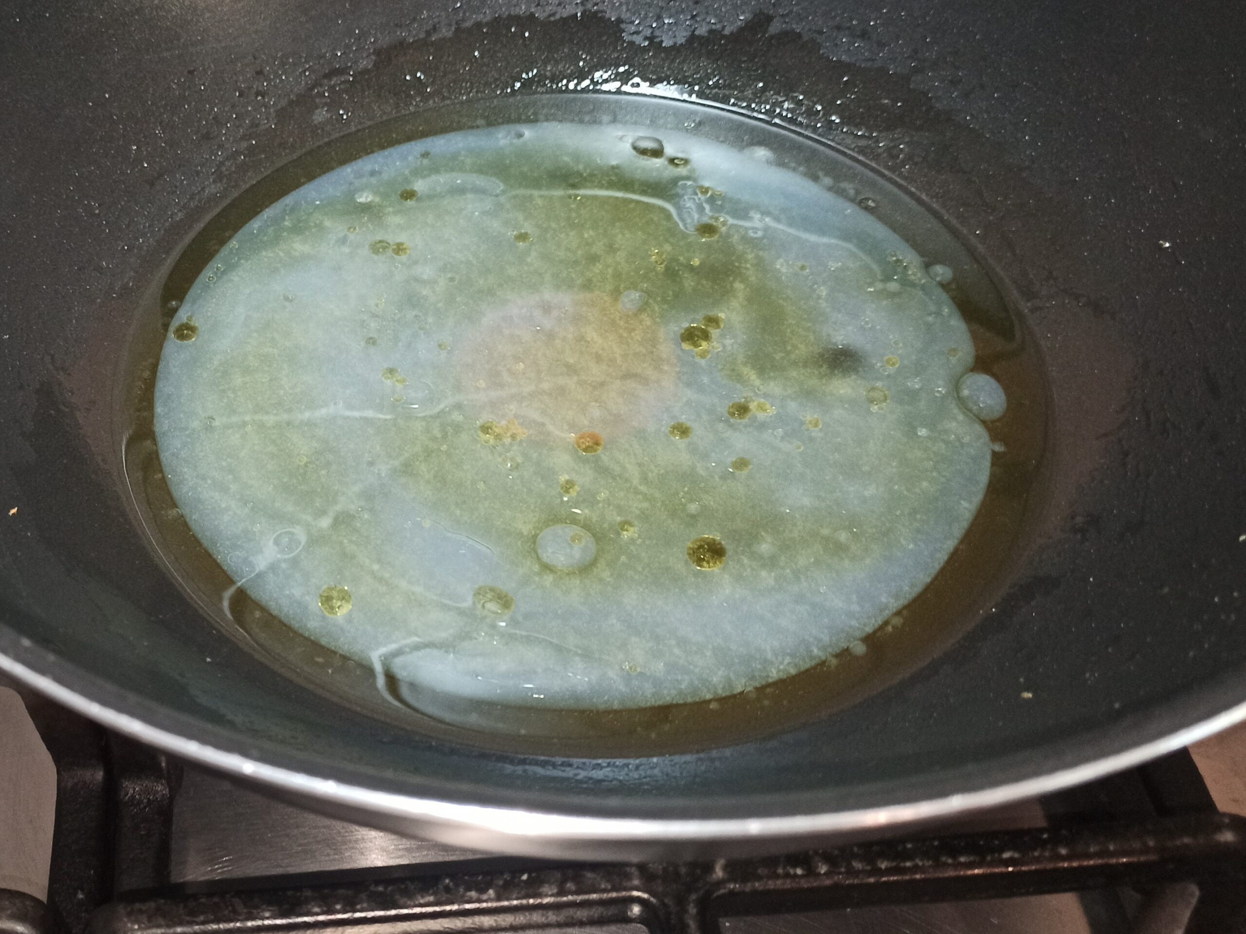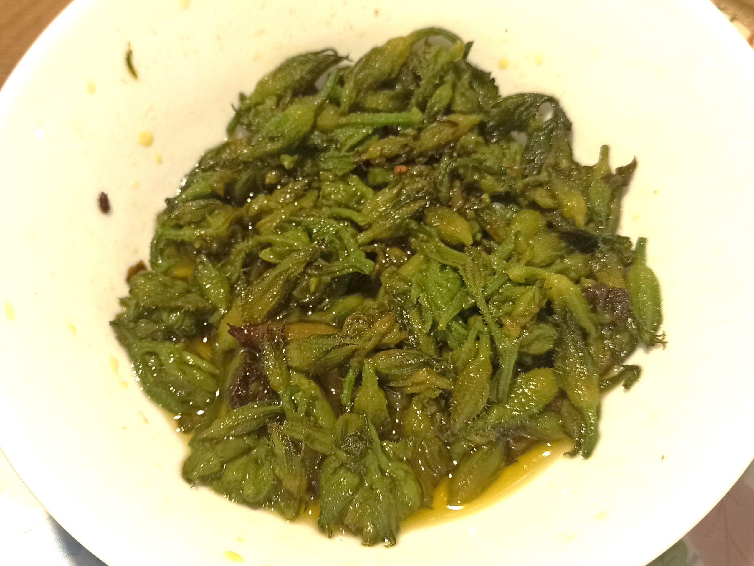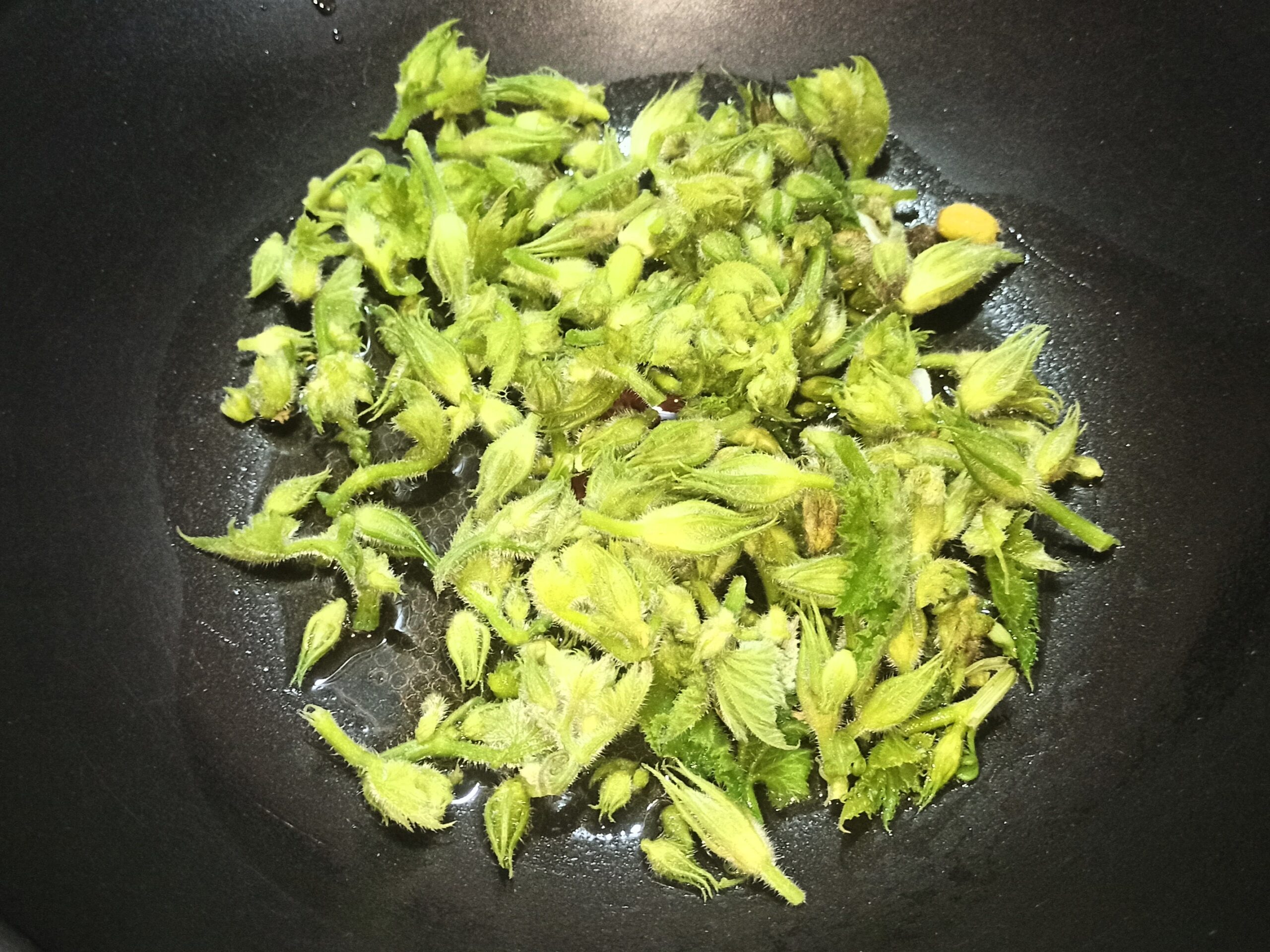 Fate sfrigolare a fiamma media, poi eliminate sia lo spicchio d’aglio che il peperoncino. Aggiungete i fiorellini di zucchine, e fateli cuocere a fiamma vivace.