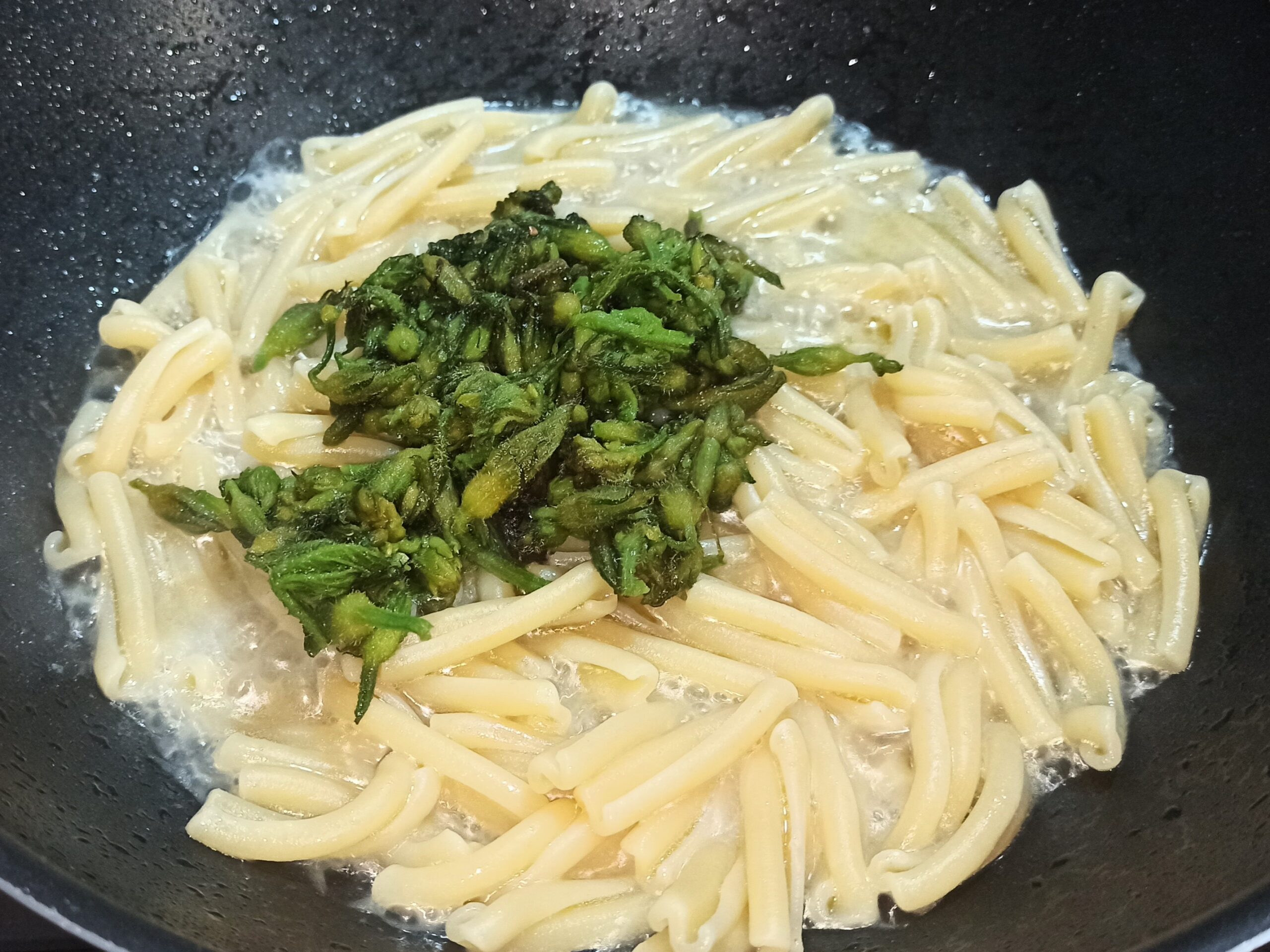 Mescolate e completate la cottura, aggiungete prima i fiorellini della zucchine,