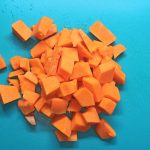 Per preparare le casarecce zucca e speck, iniziate a pulire, lavare e tagliare la zucca a dadini.