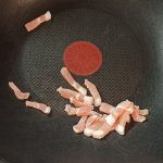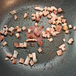 Tagliate lo speck, a pezzetti piccoli, che userete per unire alla pasta, e a striscioline, che userete per guarnire il piatto. Rosolate prima le striscioline nella padella antiaderente per qualche minuto, senza aggiungere altri condimenti e tenetele da parte, poi i pezzetti, sempre senza condimento,