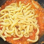 Cuocete le casarecce, in abbondante acqua salata, colatele tre minuti prima del termine della cottura, direttamente nella padella, e continuate la cottura.