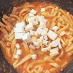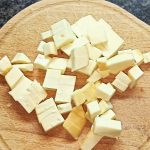 Mentre la pasta termina la cottura, tagliate la scamorza a dadini,