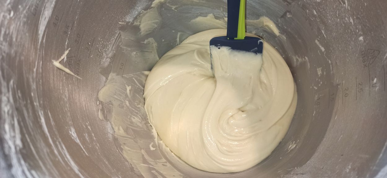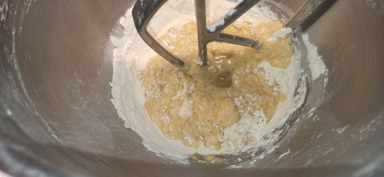 Adesso versate il tutto nella ciotola della planetaria, montate la frusta K, e aggiungete la farina poco alla volta, lavorando a velocità medio bassa.