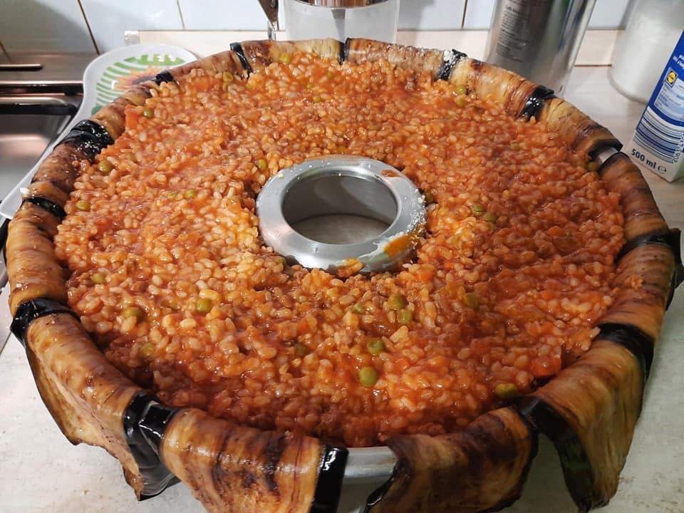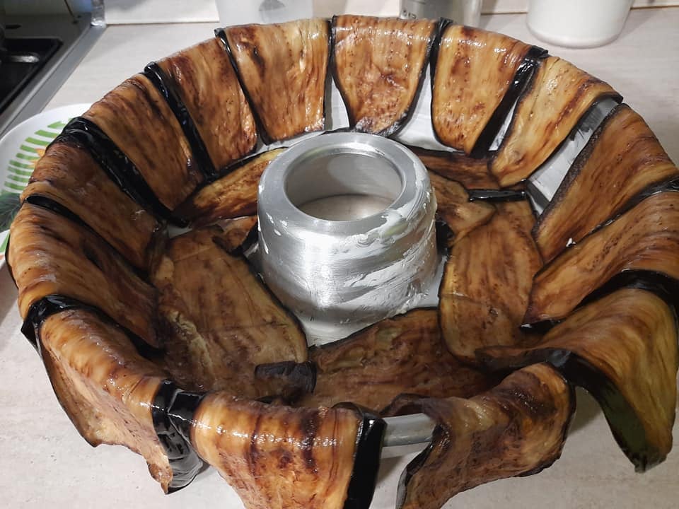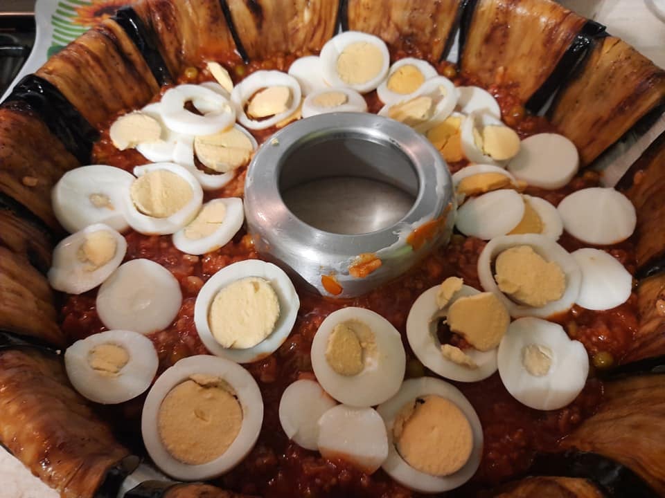 Mentre il riso cuoce facciamo le uova sode. Una volta portata ad ebollizione l’acqua caliamo le uova e lasciamole cuocere per circa 10 minuti. Una volta cotte facciole freddare e sgusciamole. Ora prendiamo uno stampo e imburriamolo leggermente. Facciamo un tappeto di melanzane, rovesciamo una parte del riso nel quale avremo amalgamato i piselli, i formaggi, la mortadella, pezzi di prosciutto, salame e poniamo sopra le uova e poi chiudiamo con altro riso e poi sigilliamo con le melanzane. Inforniamo a 180 gradi per 15/20 minuti. Un piccolo consiglio, se volete, potete aggiungere alle uova anche delle polpettine.
