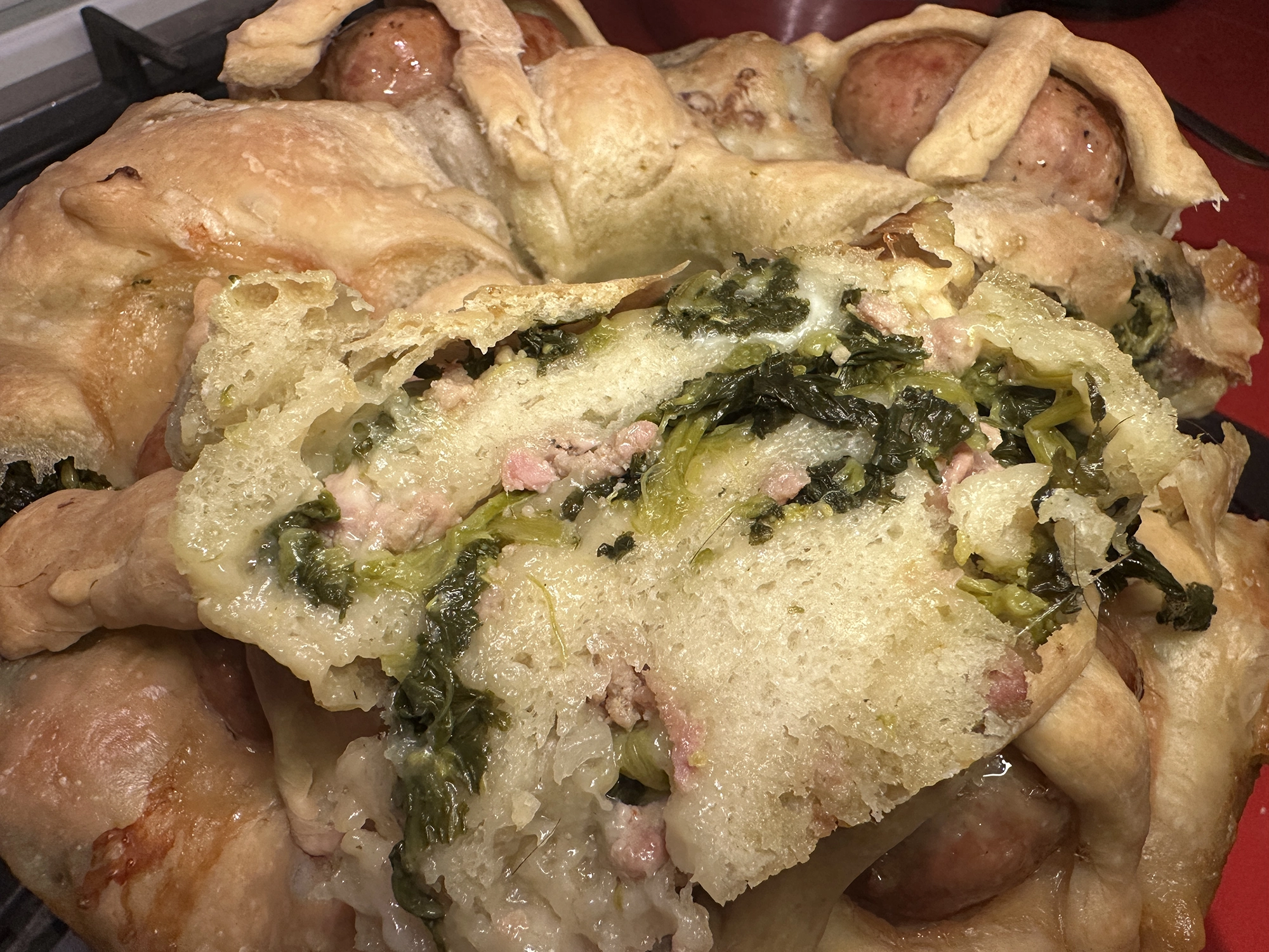 Dopo le ore di lievitazione prendiamo l’impasto. Ungiamoci le mani con l’olio e stendiamolo bene sulla spianatoia. Stendiamo più che possiamo senza romperlo. Quindi non usiamo forza. Adesso prendiamo la salsiccia sbriciolata, i friarielli il fior di latte e cominciamo a seminare su tutto il letto di impasto. Arrotoliamo bene e poi poniamolo nel ruoto come un casatiello. Prendiamo 4 salsiccette e mettiamole sul casatiello. Con un pezzo di impasto formiamo delle croci e come se fossero delle uova, facciamo la stessa cosa con le salsiccette. Inforniamo in forno statico preriscaldato a 180 gradi per un’ora.